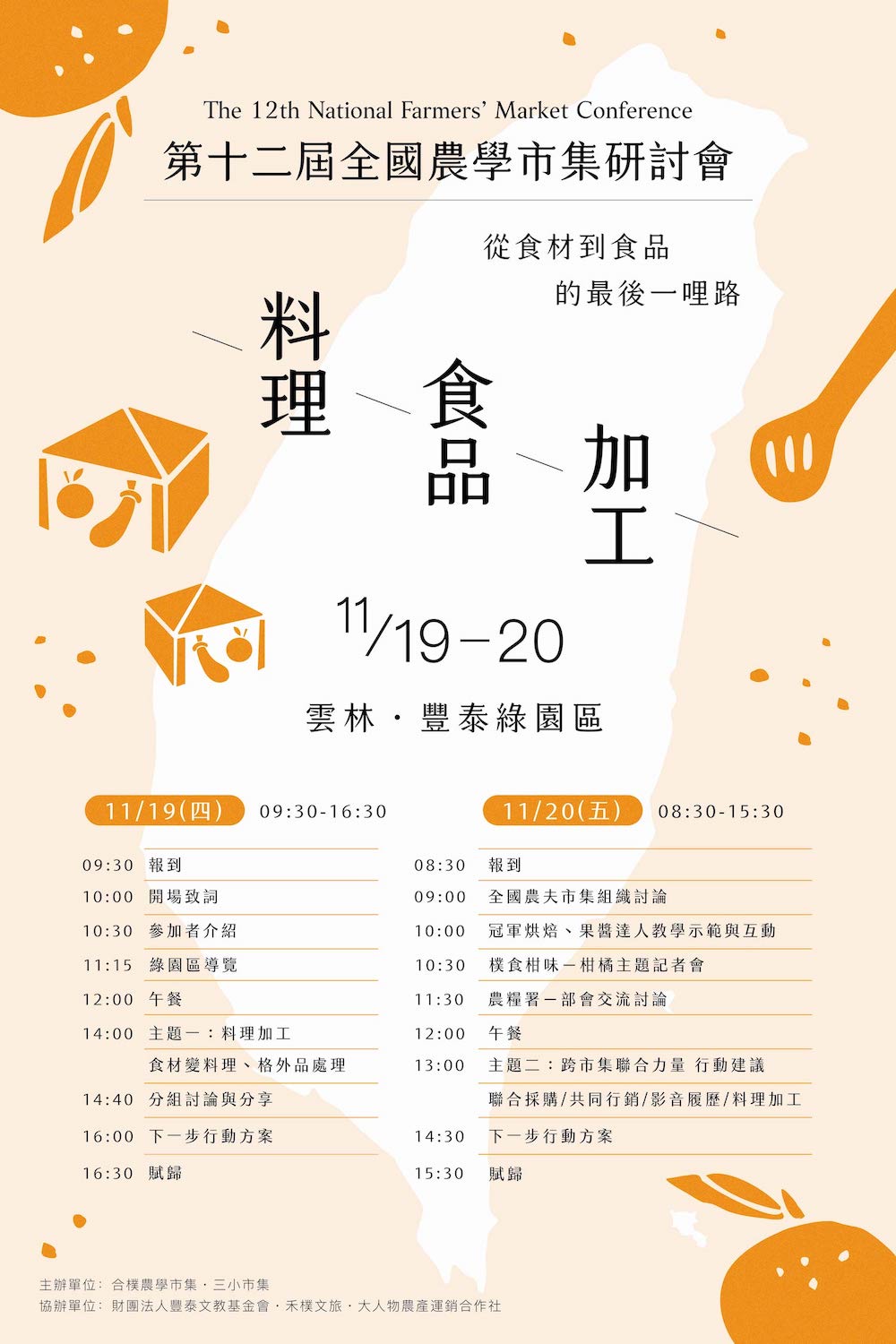 接續上一屆「合作」主題的,料理加工需要市集所有的利害關係人更多的互助與協作,農民市集歷經10多年的發展,經營上需要有創新來吸引消費者,如何共同開創新的作法,期盼藉由本次研討會彼此交流、互換經驗,讓「料理食品加工」成為接下來重要的一條新路。