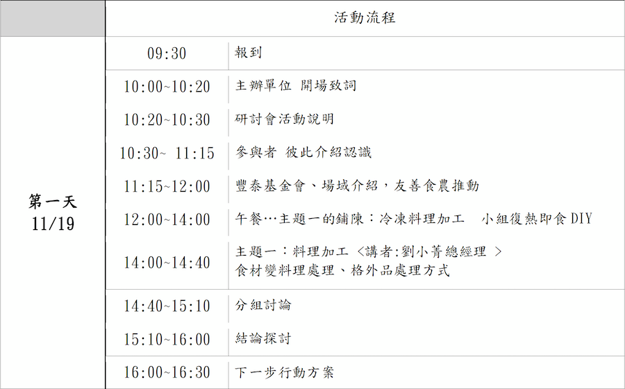 本次研討會採相互交流模式,聘請業界知名加工業者,提出具體行動方案來進行分組討論,例如:食材變料理處理、聯合採購、共同行銷、影音履歷方式等。