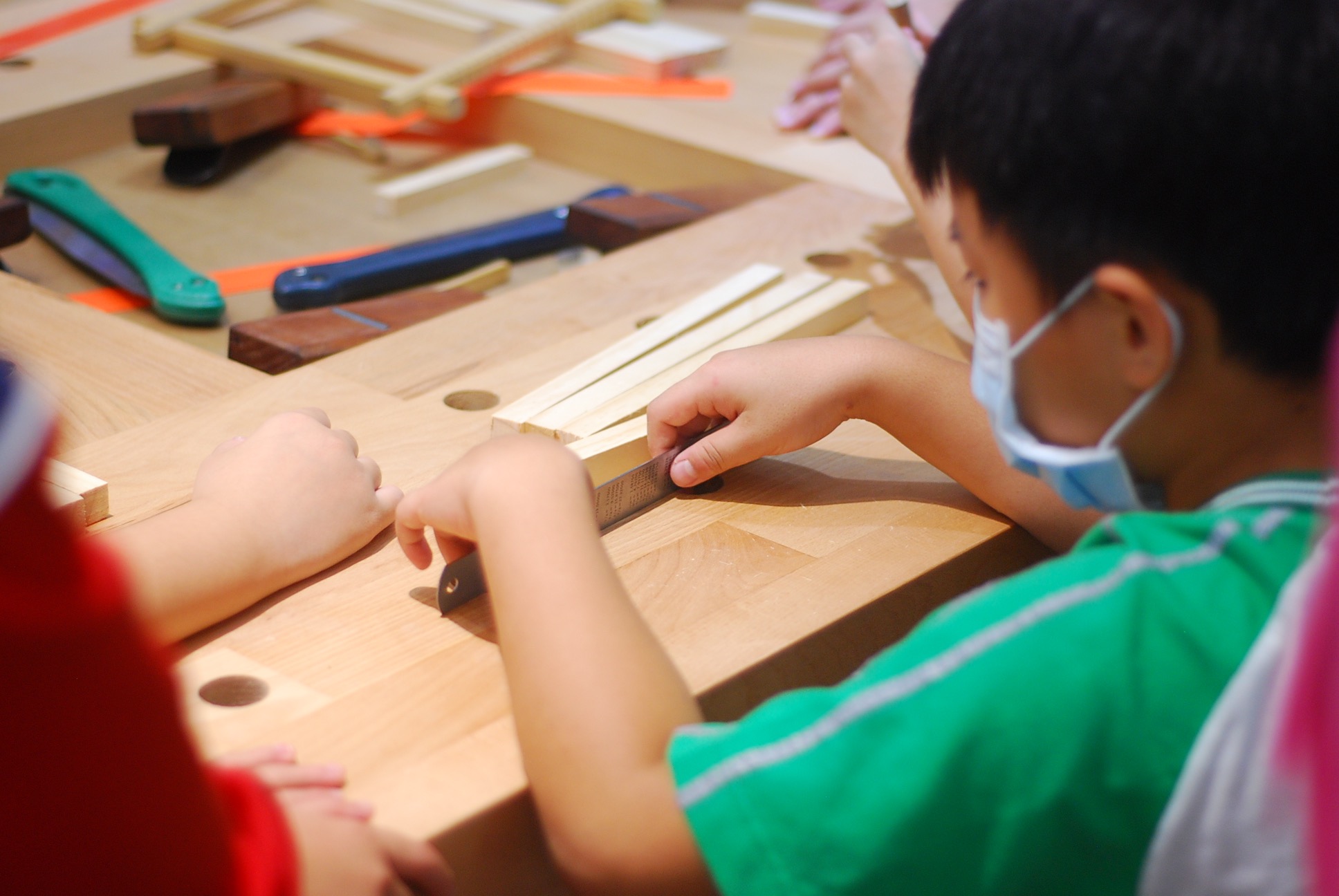 我們的梭織體驗就從製作工具開始,從裁鋸木材、刨削木屑,到榫接鑿切,透過製作工具的過程,也學習了與柔軟編織領域不同的木工技巧。