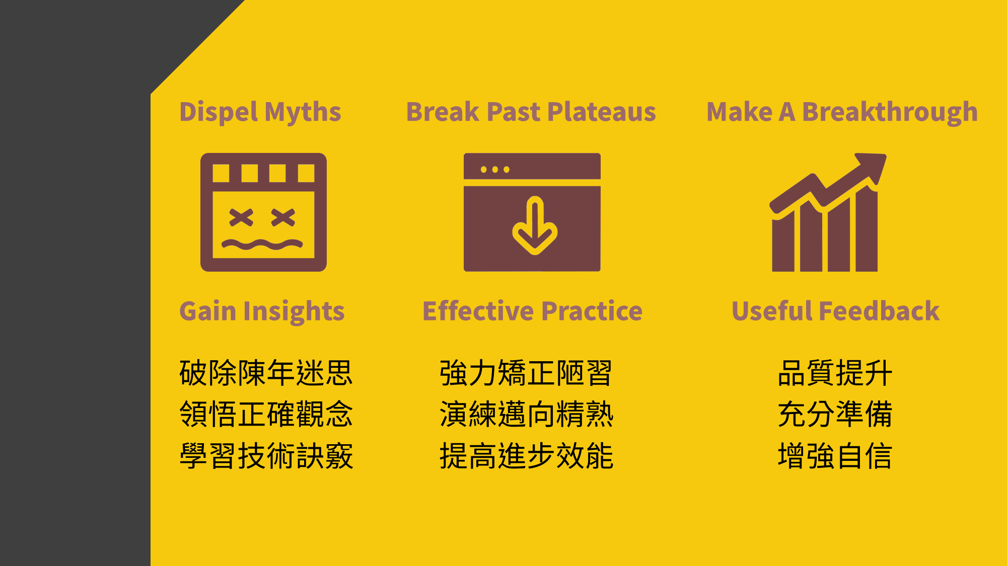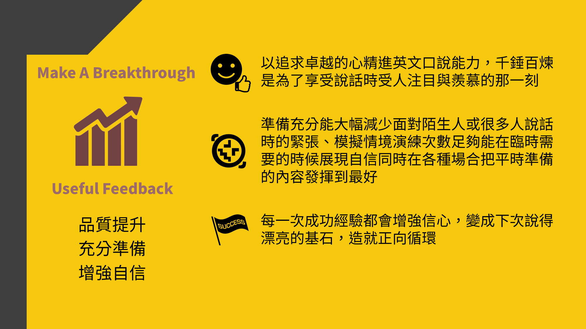 (二)常見的語言交換團體和讀書會,最大的缺點是:1. 大多數時候是去說出自己已會的,要學到新招,得靠運氣(你是否能從其他成員說話找到幾個可仿效的點,通常不會很多,東學一點西學一 點,過程很零碎);2. 一般來說沒有辦法處處被糾正,造成犯錯而不自知,長期下來恐積習難改;而練習過程缺乏糾正(其他成員頂多提供大方向、原則性、土法煉鋼的意見),導致成效很低。