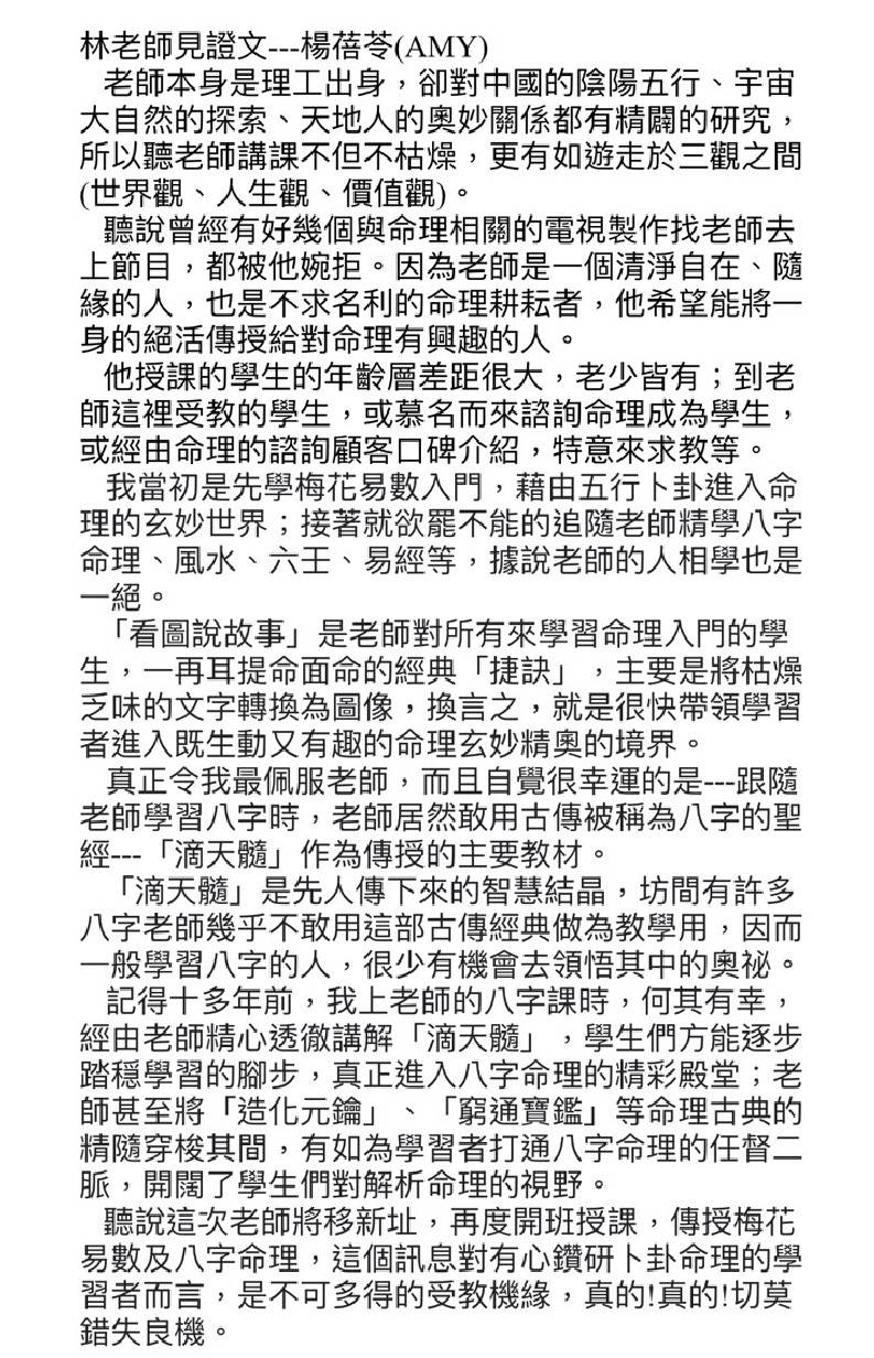 從事八字、卜卦、易經教學超過20年,杏林子弟開枝散葉者甚多
