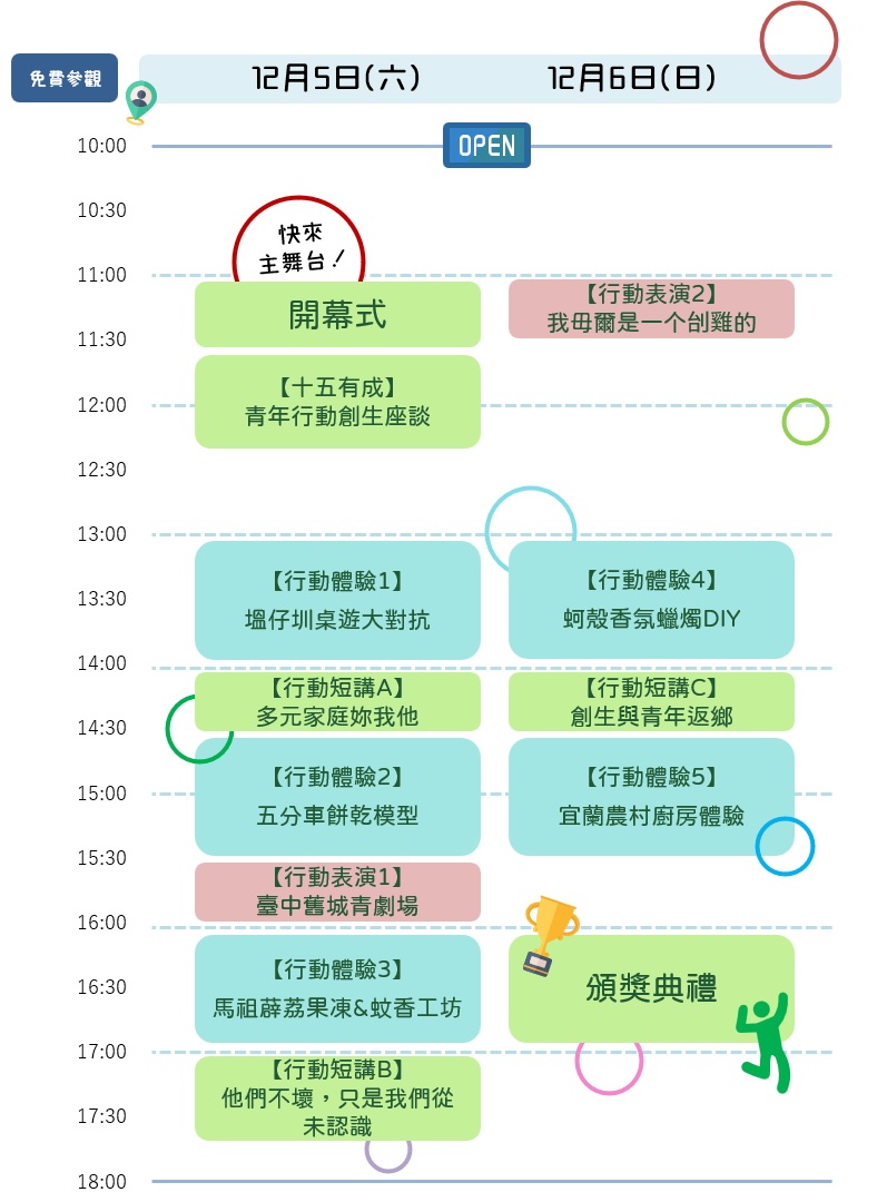 活動期間將在現場提供5堂行動體驗課程,藉由有趣且富有內涵的體驗,感受青年的創意與熱情,邀請您一同與團隊交流,歡迎親子、朋友揪團來, 活動僅開放當日現場報名,請於2樓體驗工坊領取體驗券!