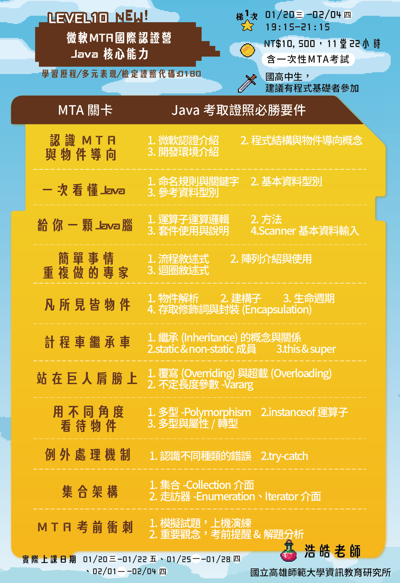 >> 課程可學習Java基礎概念,課程結束可預約時間在寰宇南京復興校教室應考MTA ,即測即評,現場領取MTA微軟授權證書。
