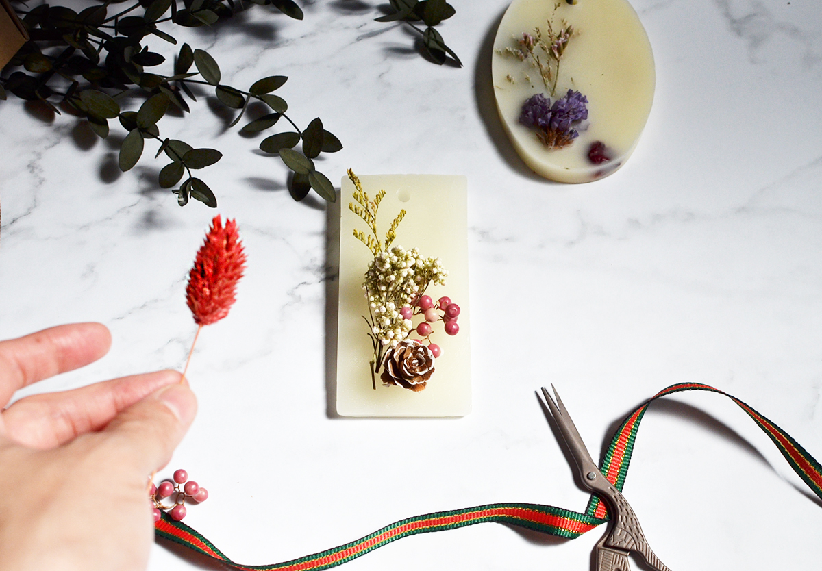 以乾燥花材製作,為精油調製的蜜蠟芳香掛飾,可掛於衣櫥、起居空間,隨時享受個人香氛、美麗持久的小花園。JL以豐富的植物與香氛經驗,帶領學員進入花材與古典凝香蠟的世界,並以天然素材製作出有個人風格的凝香蠟片。