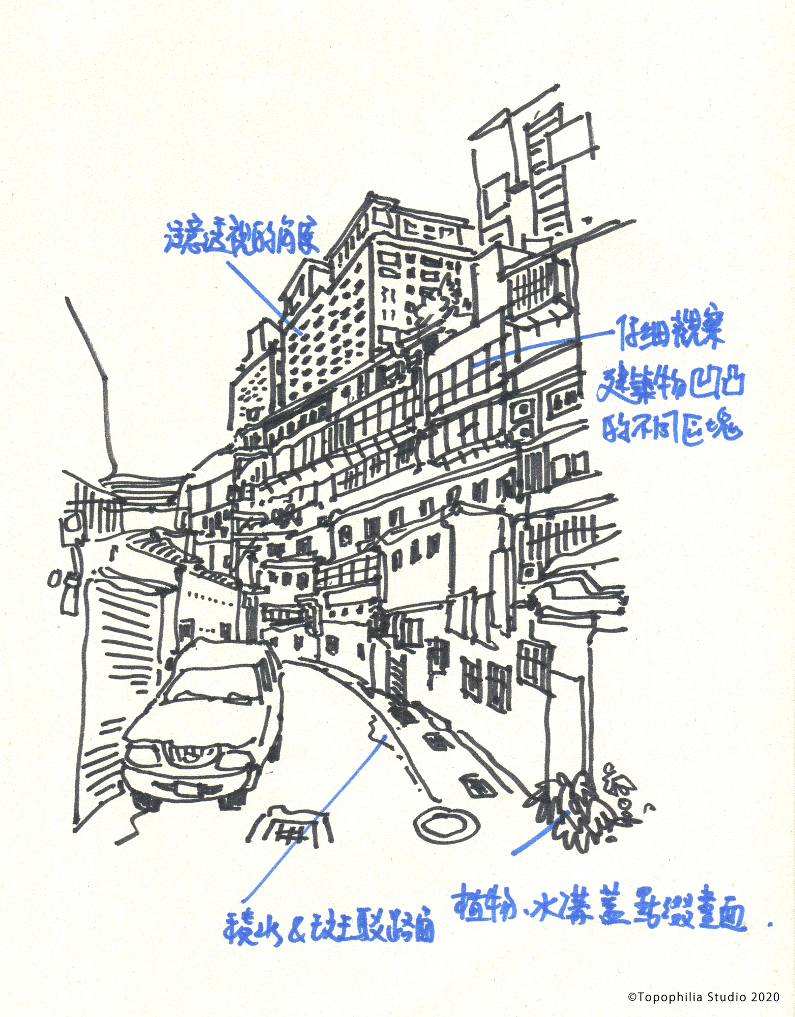 本活動邀請參與者觀察的城市風景既不是膾炙人口的設計師作品,也非著名的歷史建築,而是你我記憶中最習以為常的台灣城市面貌。我們生活於其中的街道其實處處充滿細節,本活動除了介紹速寫的基本概念,並透過「畫畫」引導參與者凝視我們身邊的尋常住屋,從速寫體驗感受城市的各式樣貌。