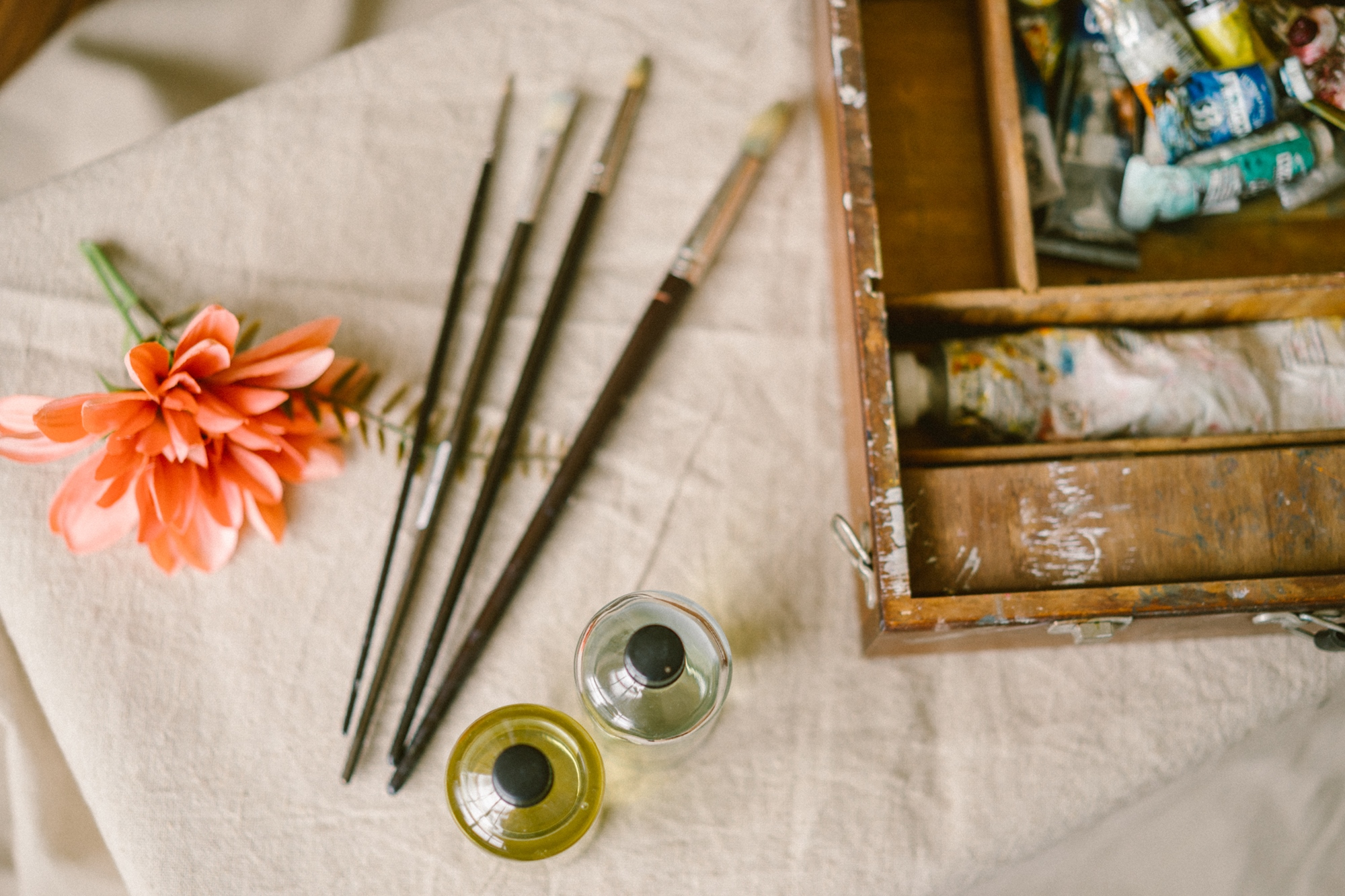 繪畫用具|圍裙、大小筆刷、筆洗、調色盤、紙巾、吹風機