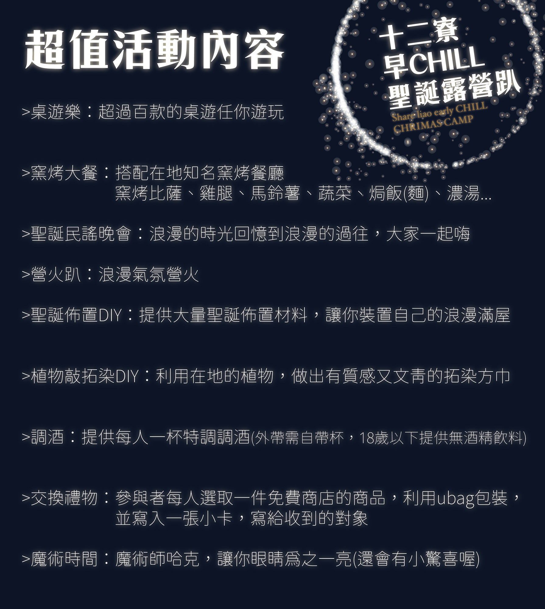 (包含:桌遊樂、窯烤大餐、聖誕民謠晚會、營火趴、調酒、魔術時間、聖誕佈置DIY、植物敲拓染DIY及等相關費用)