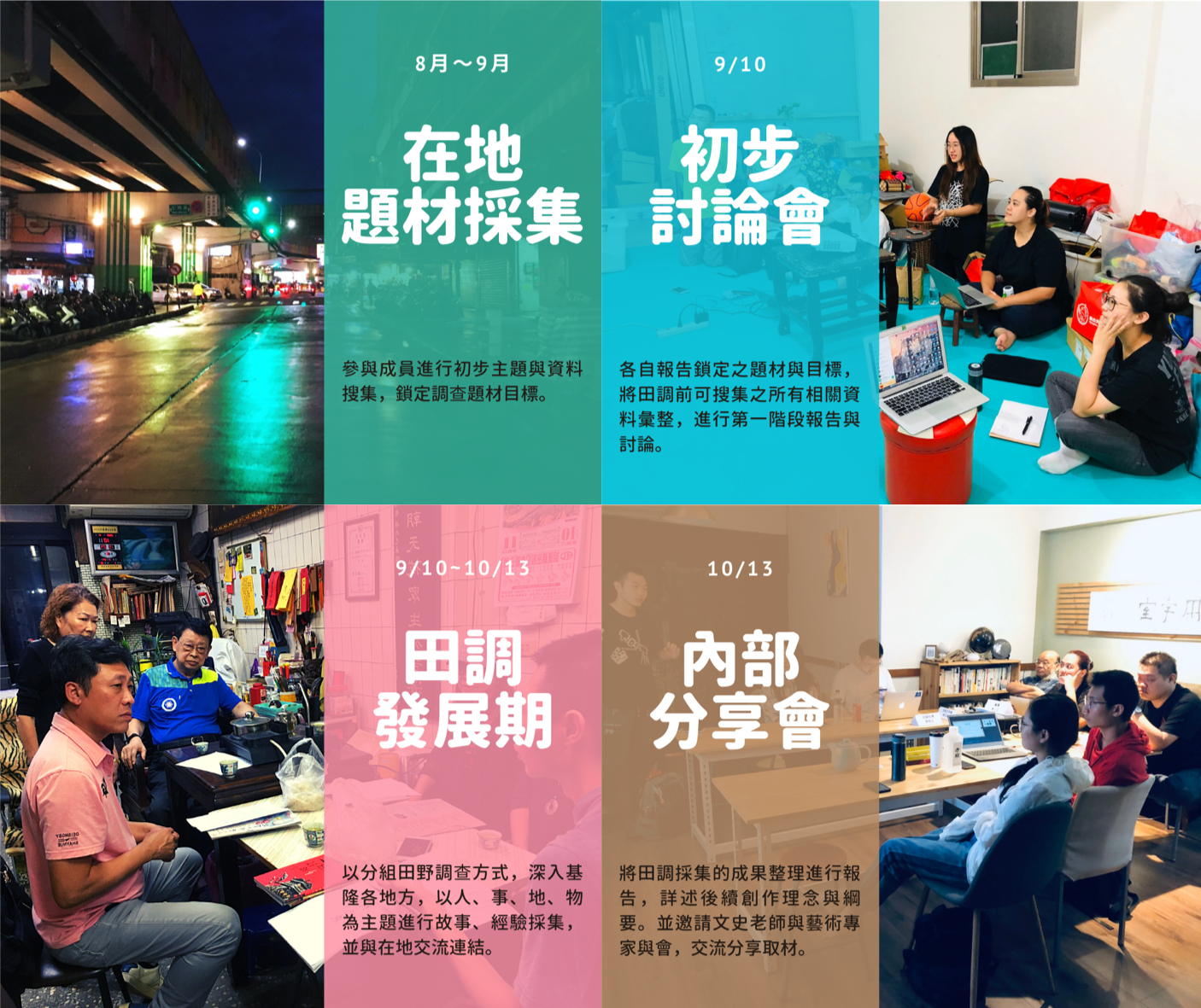 本次活動透過團員進行在地題材收集、內部會議報告與討論,田調發展期深入基隆地方,進行資料搜集、訪問或故事採集、再歷經內部多次討論分享,完成作品編創與進行密集排練,最終產出作品完成展演!