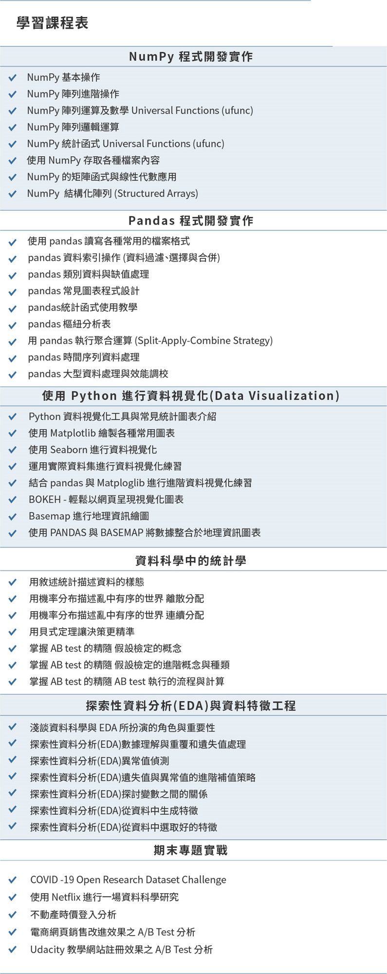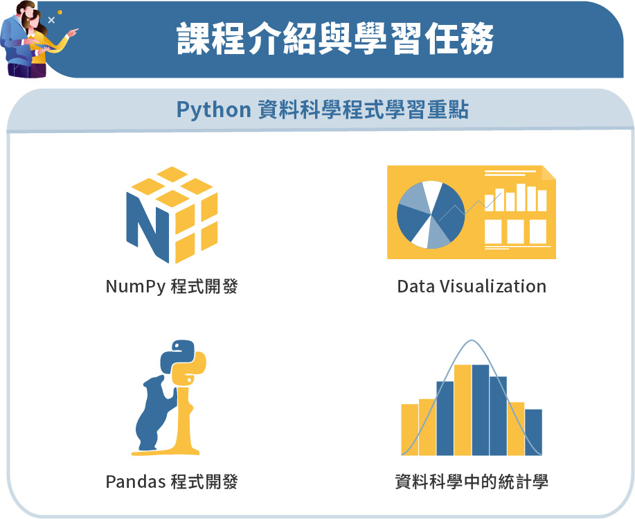 - 一次讓你了解如何應用 Python 解決各種資料科學的問題,本課程將完整教你如何開發 Python Data Science Programming:Numpy 陣列操作、數學函數與統計函數、I/O、結構化陣列