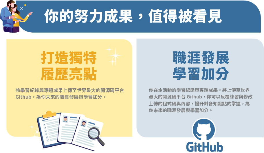 - 你在本活動的學習紀錄與專題成果,將上傳至世界最大的開源碼平台 Github,你可以反覆練習與修改上傳的程式碼,提升對各知識點的掌握,而這些紀錄將為你未來的職涯發展與學習加分。