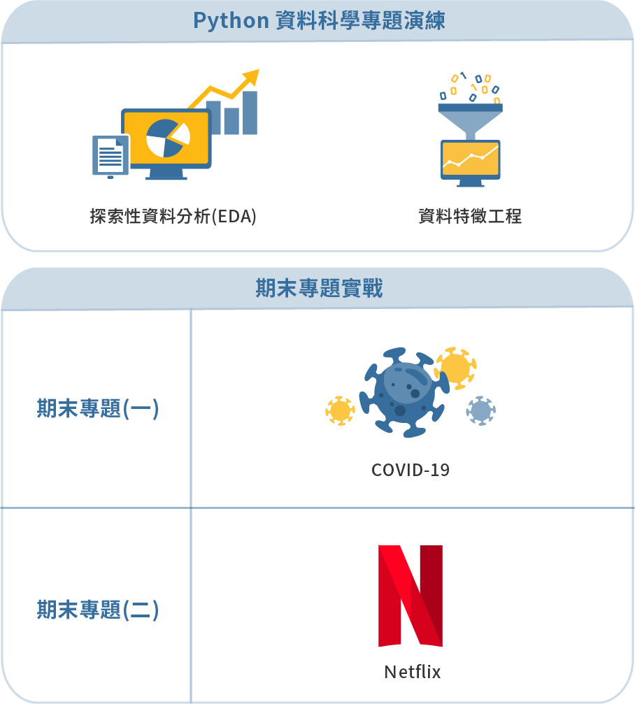 - 運用所學知識實際進行資料科學中重要的 EDA(探索性資料分析),並由專家出題設計多個資料科學專題,強化你的資料科學實作能力
