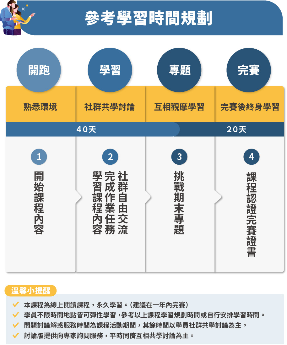 上述時間為課程釋出時間,課程釋放後學員可隨時報名參加,無需等待其他學員一同開跑。