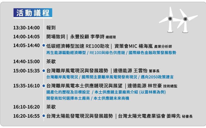 台灣離岸風電本土供應鏈現況與展望 | 國產化的歷程及目標設定 本土供應鏈主要廠商介紹 - 以雲林案為例 開發商如何選擇本土廠商 本土供應鏈未來商機 | 0.5 |