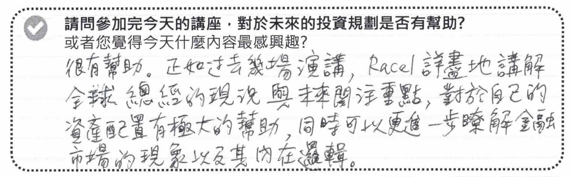 每年來聽 Rachel 精彩的經濟分析,總是覺得有從迷霧、各方雜訊中脫身,稍稍看清前方路線的感受,感謝每年總是不吝拿出所有專業經驗與我們這些投資幼幼班分享,你們讓我們有了投資的勇氣!下次可以多舉辦一些場次嗎?