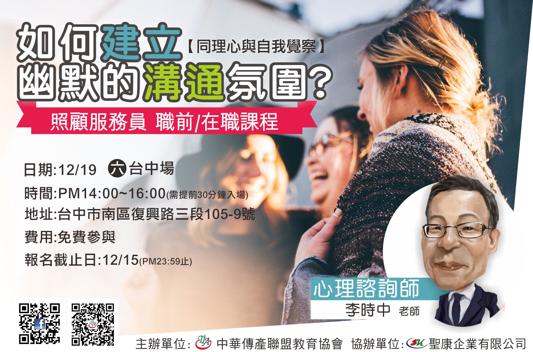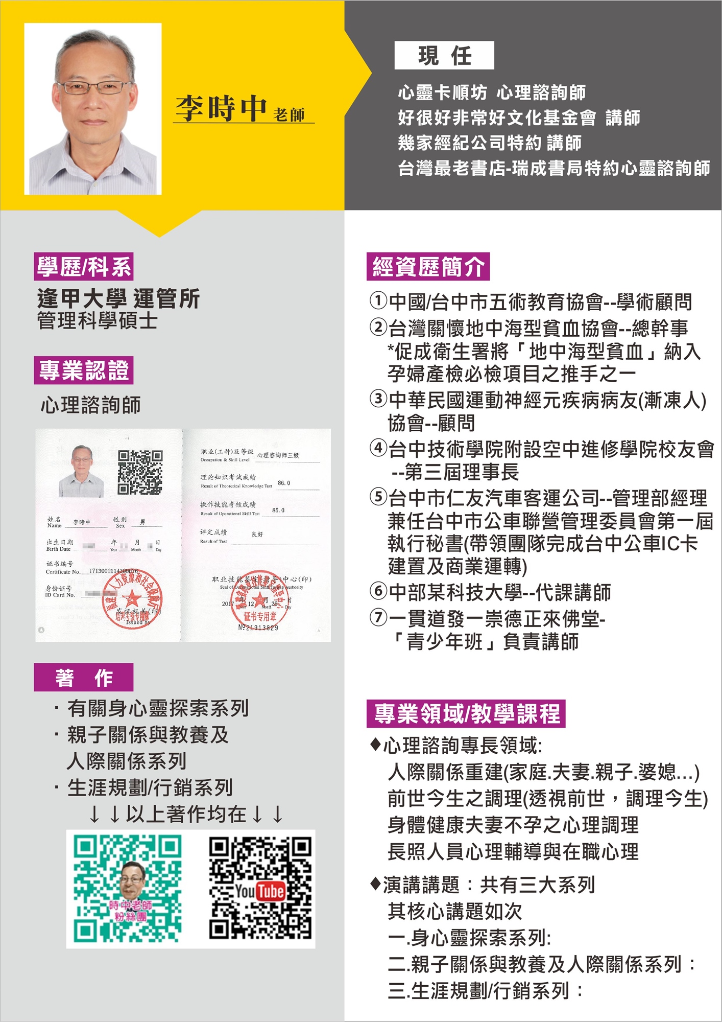 隆重邀請心理諮詢師 李時中 老師指導