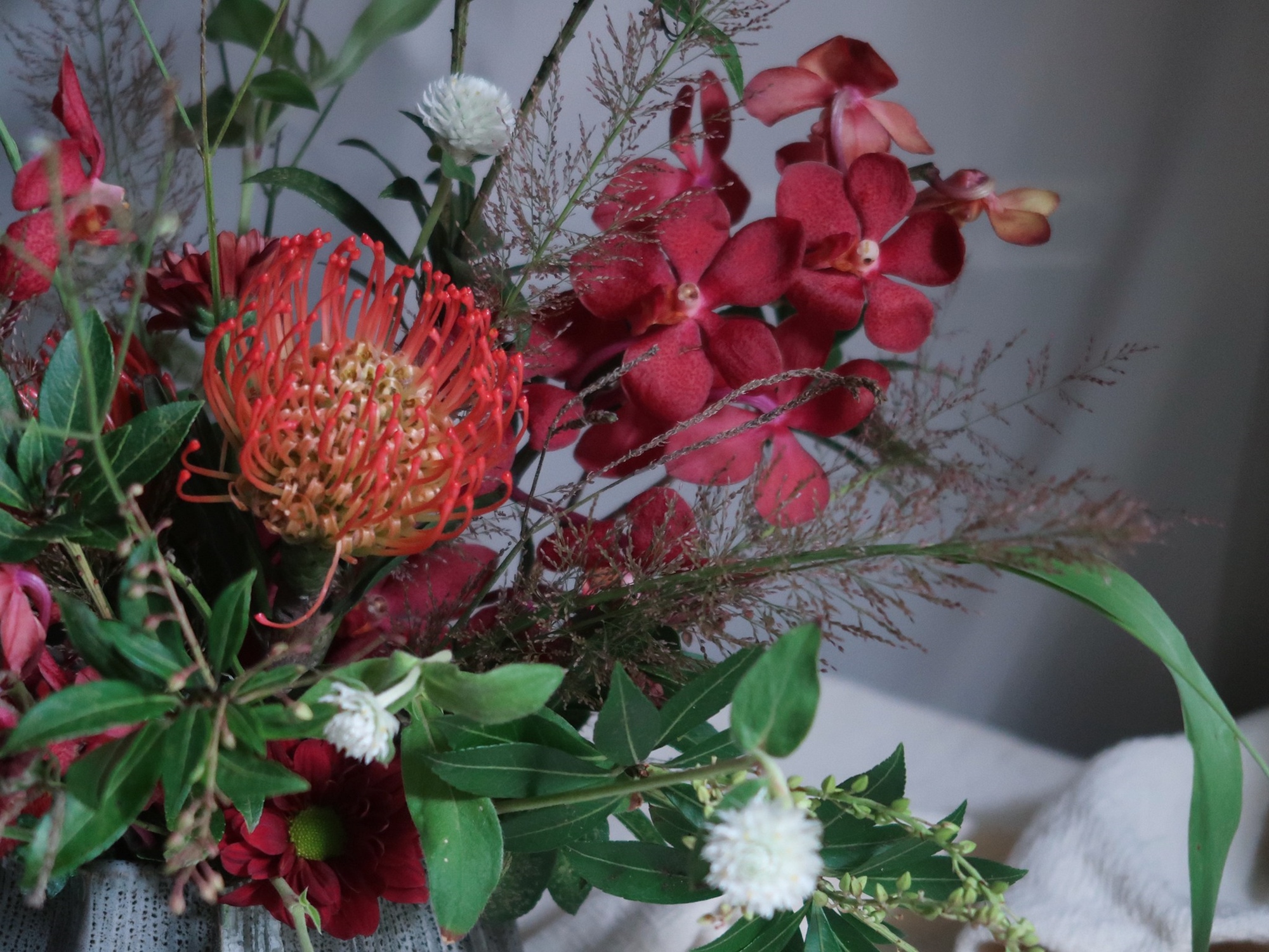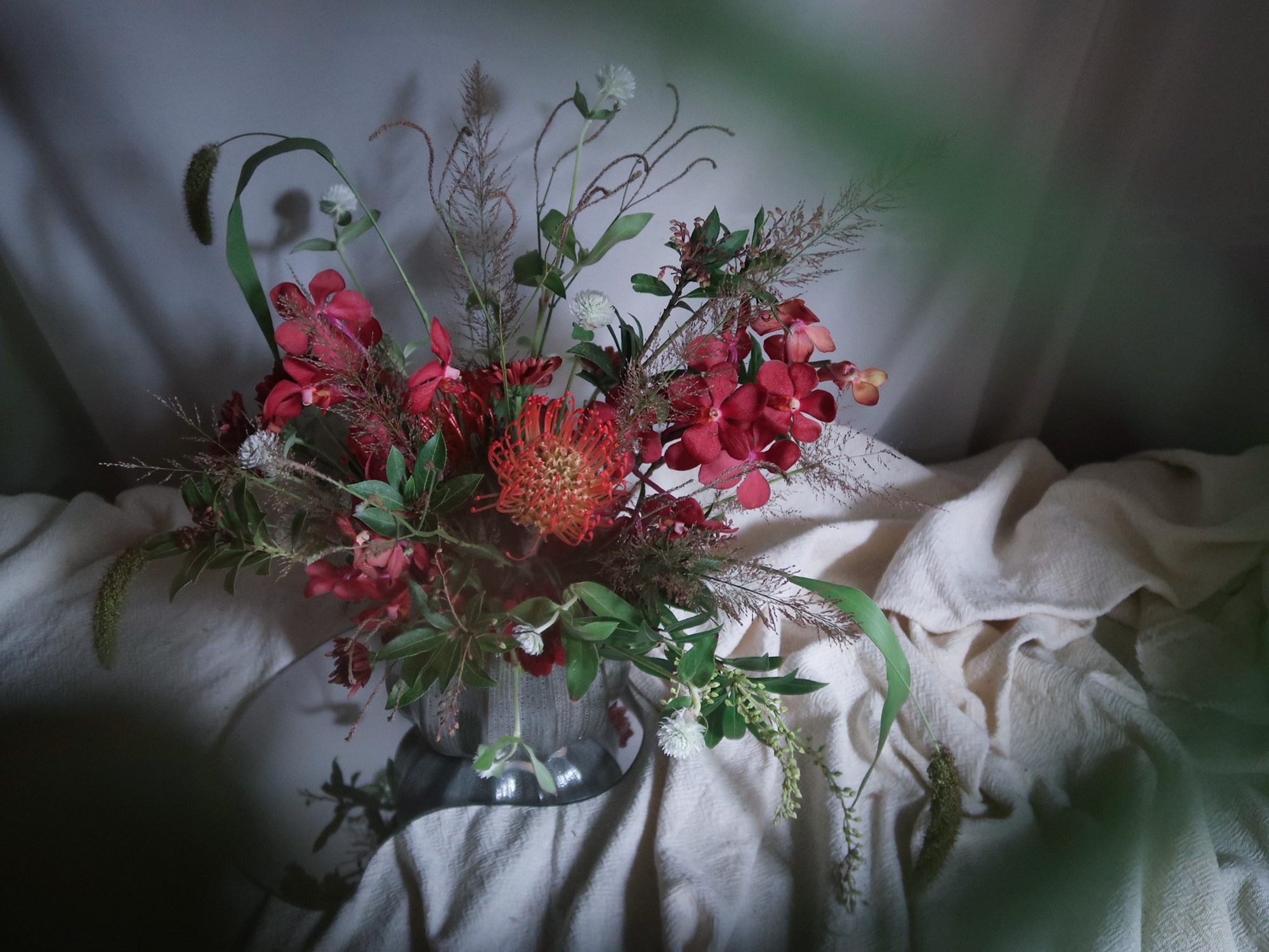 選用各種層次的紅色表現 ex顯少使用的針墊花及當季咪咪草…