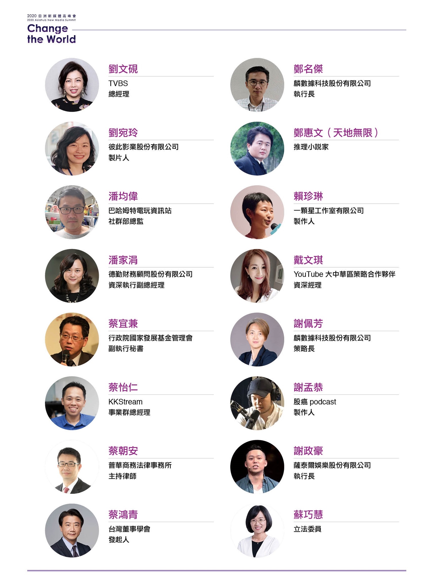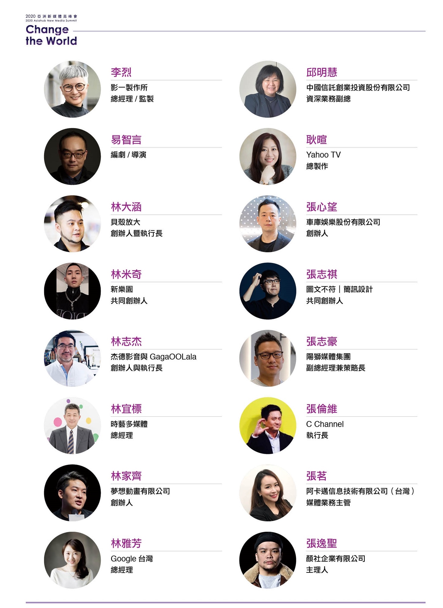《2020 亞洲新媒體高峰會》將於 2020 年 12 月 21、22 日,在台北文華東方酒店舉辦為期二日的精彩研討會,以 ChangeTheWorld 為主題,擴大以「資本化、數位化、全球化、在地化」等四方向議題探討,邀請來自各地的頂尖產業領袖,為台灣致力於泛娛樂產業的專業人士,攜手掌握全球新媒體產業的趨勢脈動。本次高峰會幸得文化部、文策院及台北市政府文化局等從中央到地方的官方組織支持,國際品牌企業Netflix、Line、Akamai、Youtube也是高峰會的策略贊助者,結合產官學專家參與,預計兩天約莫將有千人到場參加盛會,同步由YahooTV團隊協助提供線上直播,讓高峰會精彩內容可以讓更多海內外華人觀看。