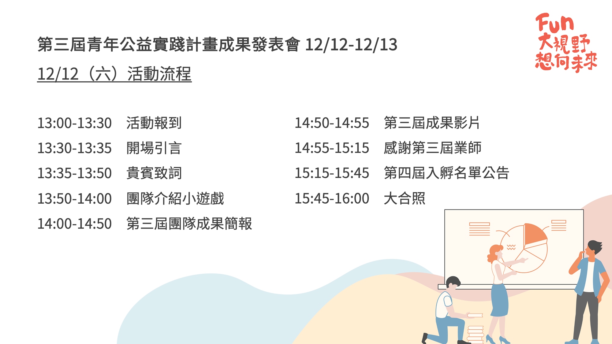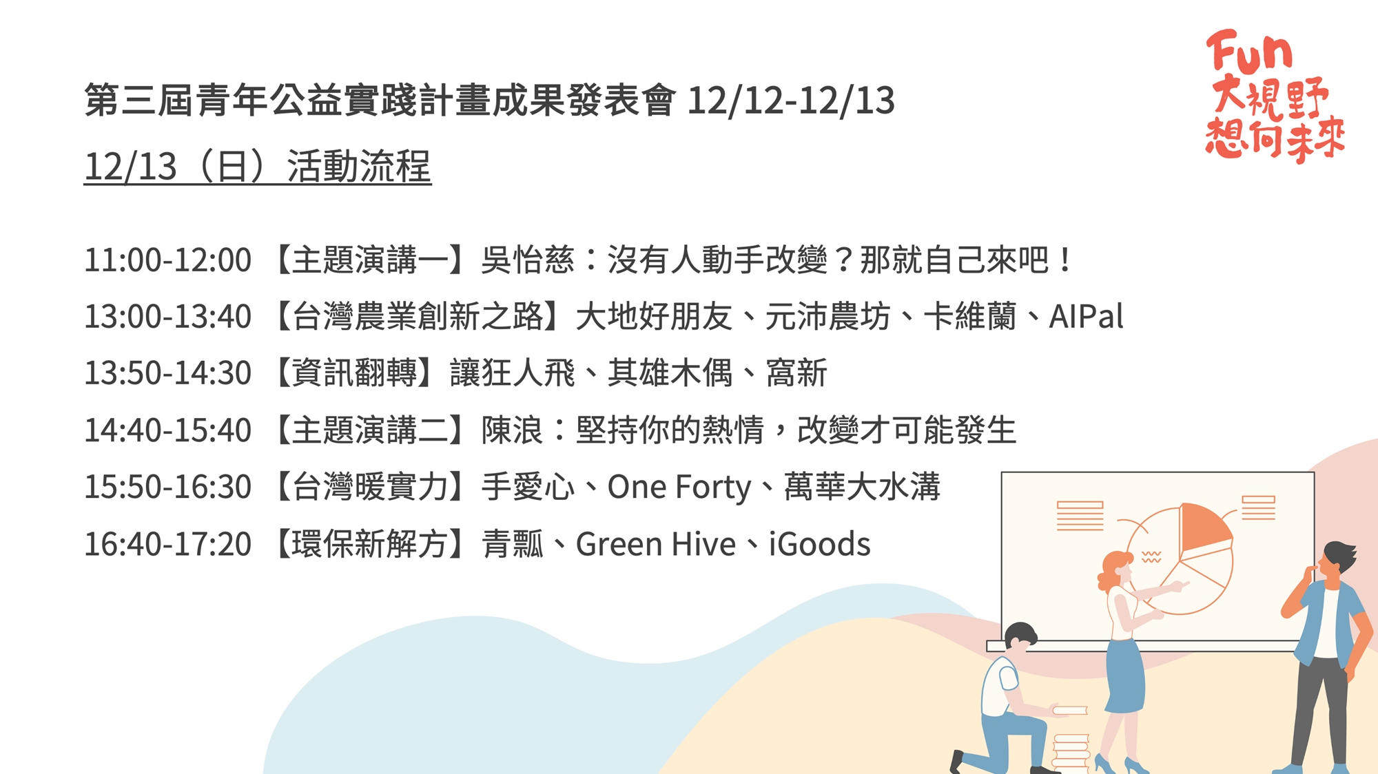 12月12日至13日的上午11點至下午18點,六日兩天都有第三屆入選團隊的攤位展示,邀請您一起前來認識這些出色的社會創新夥伴,並參加本次的12/12的第三屆青年公益實踐計畫成果發表會暨第四屆團隊入選典禮,以及12/13的各團隊【社創Fun開講】系列座談 ,讓我們一起在社會創新路上同行!