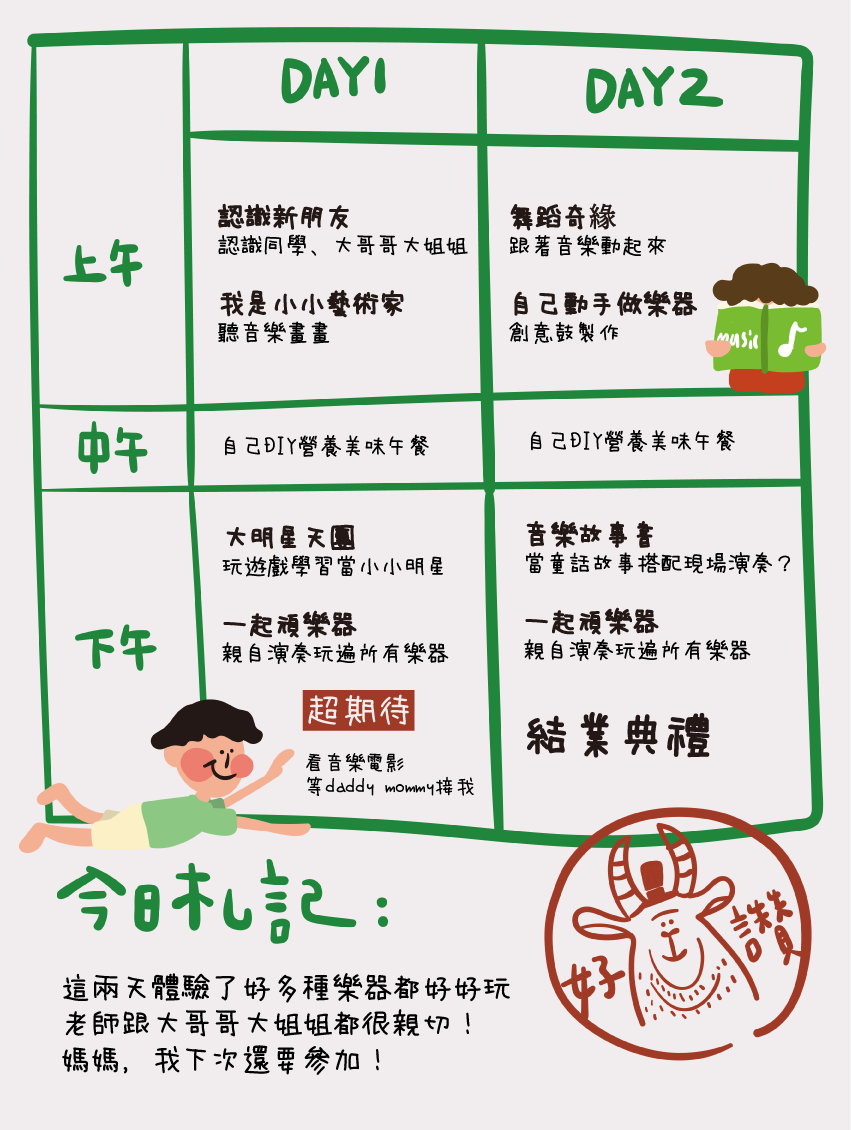 *樂器體驗至少包含「爵士鼓、鋼琴、歌唱、吉他、古典樂器」,兩天為不同種類的樂器,報名整梯次的話可以體驗到5-8種以上樂器唷!