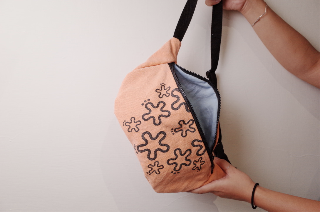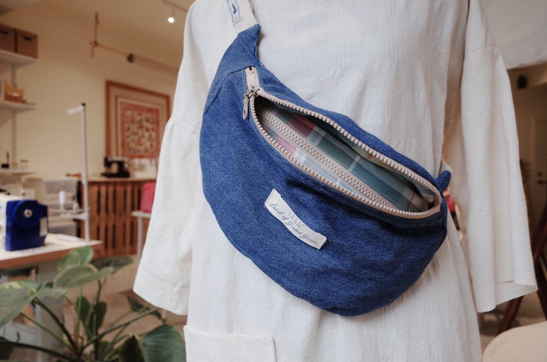10/10・10/11 學生作品 - 用了10年的喜憨兒帆布袋,硬挺的材質做改造成腰包可以再用10年,內裏使用之前參加53洋裁課程剩下的布料