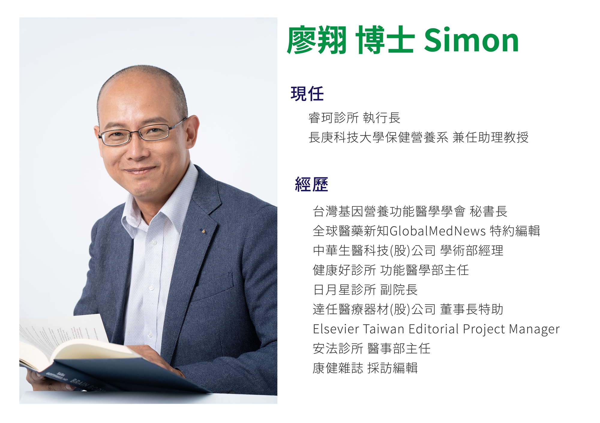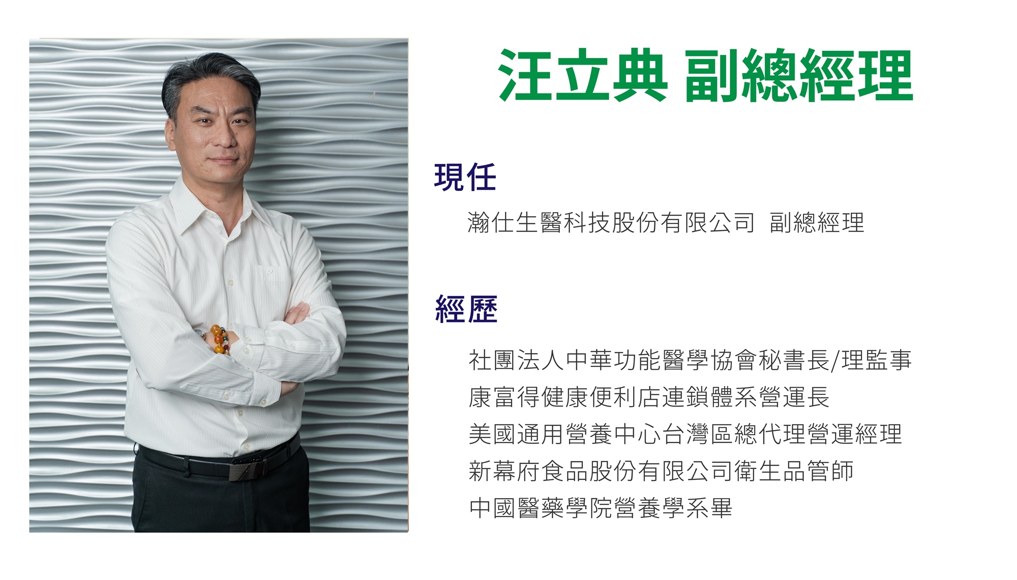 心血管相關疾病已成為全球人類死因佔比之首,而其中80%以上皆與血管內皮功能障礙有關。血管功能障礙早期不易自覺,嚴重後果往往造成難以挽回的缺憾,尤其當未能早期評估之下,容易因不適當的生活飲食與運動方式加速對身體機能的損害,不可不慎。本節課程中將會針對如何經由功能醫學分析來了解血管內皮的功能狀態,以及如何從中檢視相關營養缺陷與潛在風險因子,進而應用這些功能指標來輔助醫師、營養師、護理師及健康管理師制定更精確的膳食計畫、運動處方等個人化照護方案。