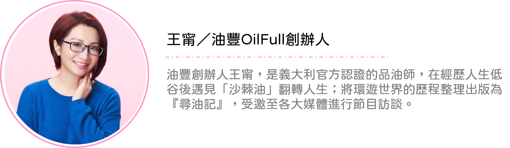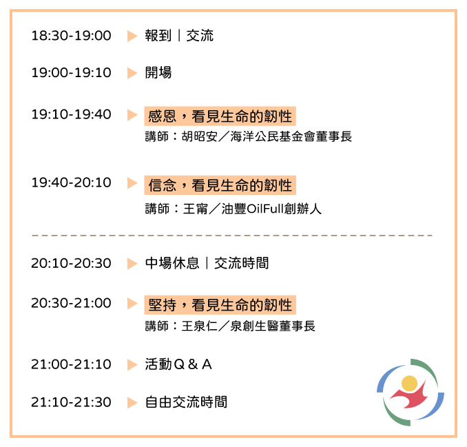 本次活動,邀請到從癌症瀕死低潮重生的瘋油人/品油師-王甯、從失去中找到信念的泉創生醫董事長-王泉仁、送愛到故鄉的超人爸爸/海洋公民基金會董事長-胡昭安。將與您分享他們在逆境中走過的人生風雨波濤,從而翻轉生命的人生故事。揭露內心深層且不為人知的心境感受,以及如何面對低潮、轉變,並找到生命出口?