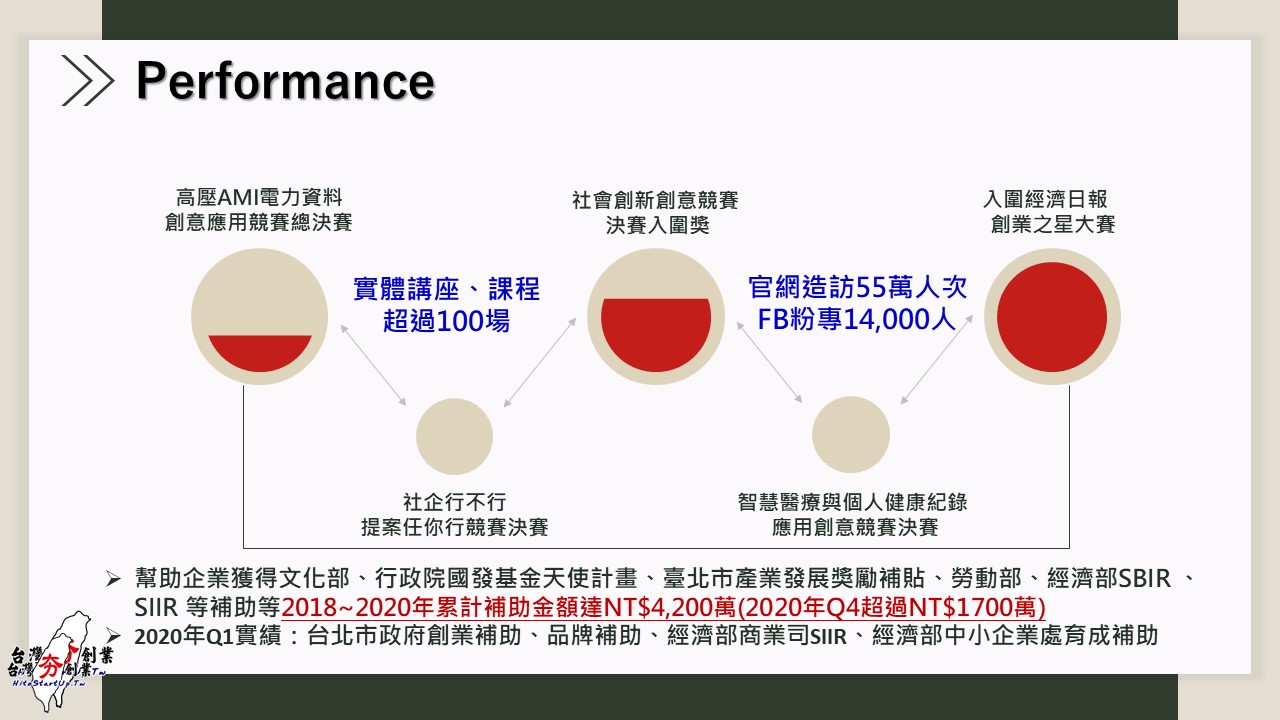 本團隊曾主導並協助客戶產品榮獲資訊月百大產品創新獎、新創事業獎、婦女創業菁英賽、雲端創新應用服務競賽、新興產業加速育成計畫育成先鋒獎、經理人月刊百大經理人,通過計畫項目囊括文化部、台北市地方型研發補助、行政院國發基金天使計畫、臺北市產業發展獎勵補貼、勞動部、經濟部SBIR/SIIR、台北市產發局合作計畫等計畫。自2018年起累積獲補助金額已超過NT$4,200萬以上,輔導領域包含研發、文創、大型專案等,為您從創業草創期、擴張期到成長期提供完整的政府補助申請輔導,直至獲得補助後亦提供後續服務到計畫結束,讓您無後顧之憂。