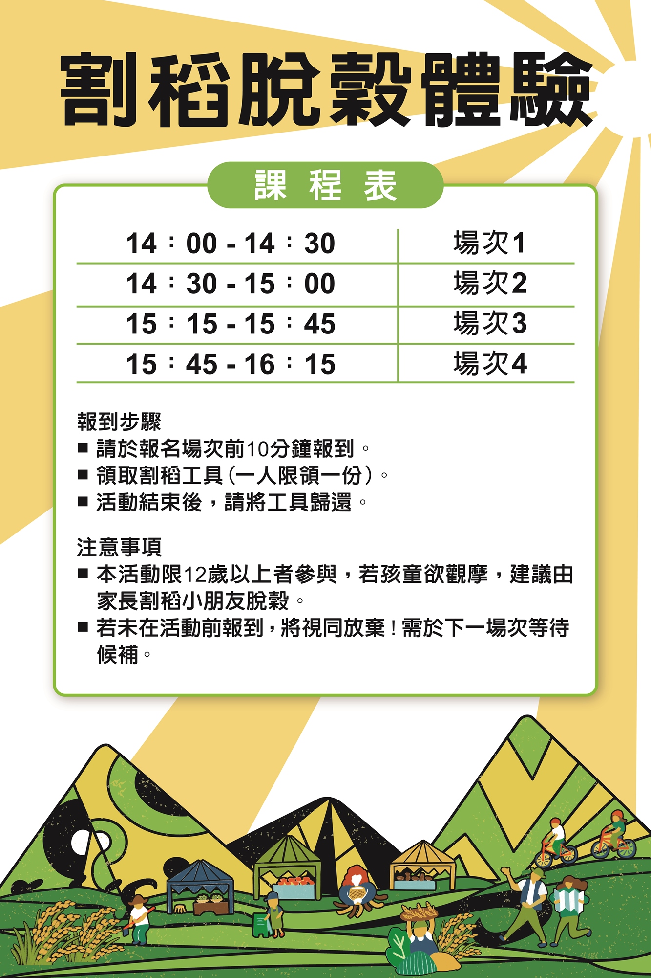 - 為確保收割活動之安全性,「割稻脫穀」限12歲以上者參加,若有12歲以下孩童欲參加,可由家長執行割稻,小朋友脫殼。