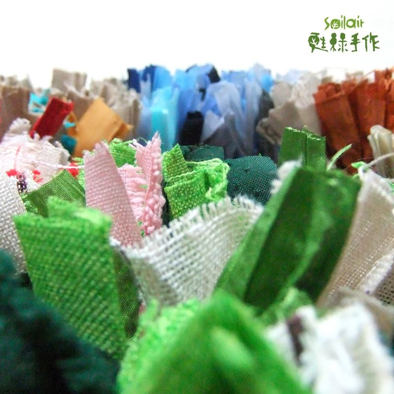 設計師muyi將她的配色專業,運用在五顏六色的工廠餘布邊,手工編織成居家暖心用品。志在升級改造工業廢料,減少二次污染。希望透過作品讓人們看見廢料改造的可能性,並進一步增加永續產品的使用。目前除了實驗開發更多用途外,也正在進行餘布邊圖像藝術創作。
