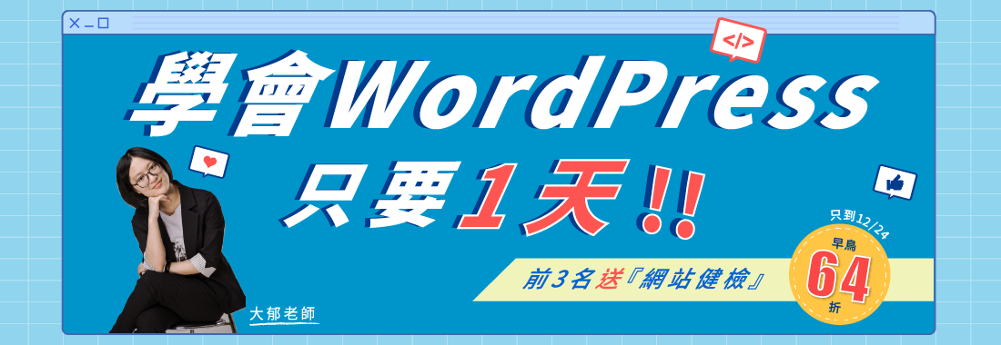 - 前3名購買【大郁老師Wordpress網站架設】課程的學員,即可免費預約網站健檢諮詢服務