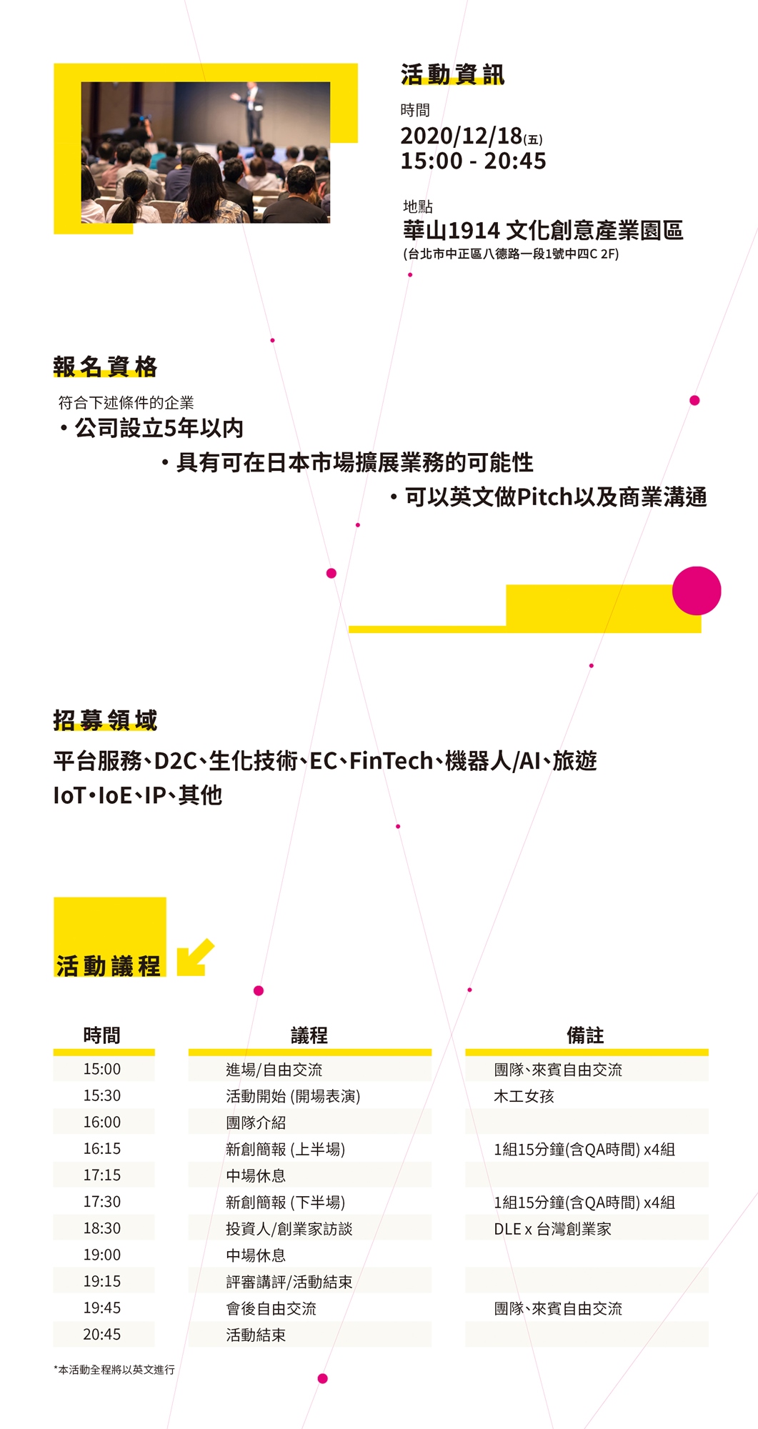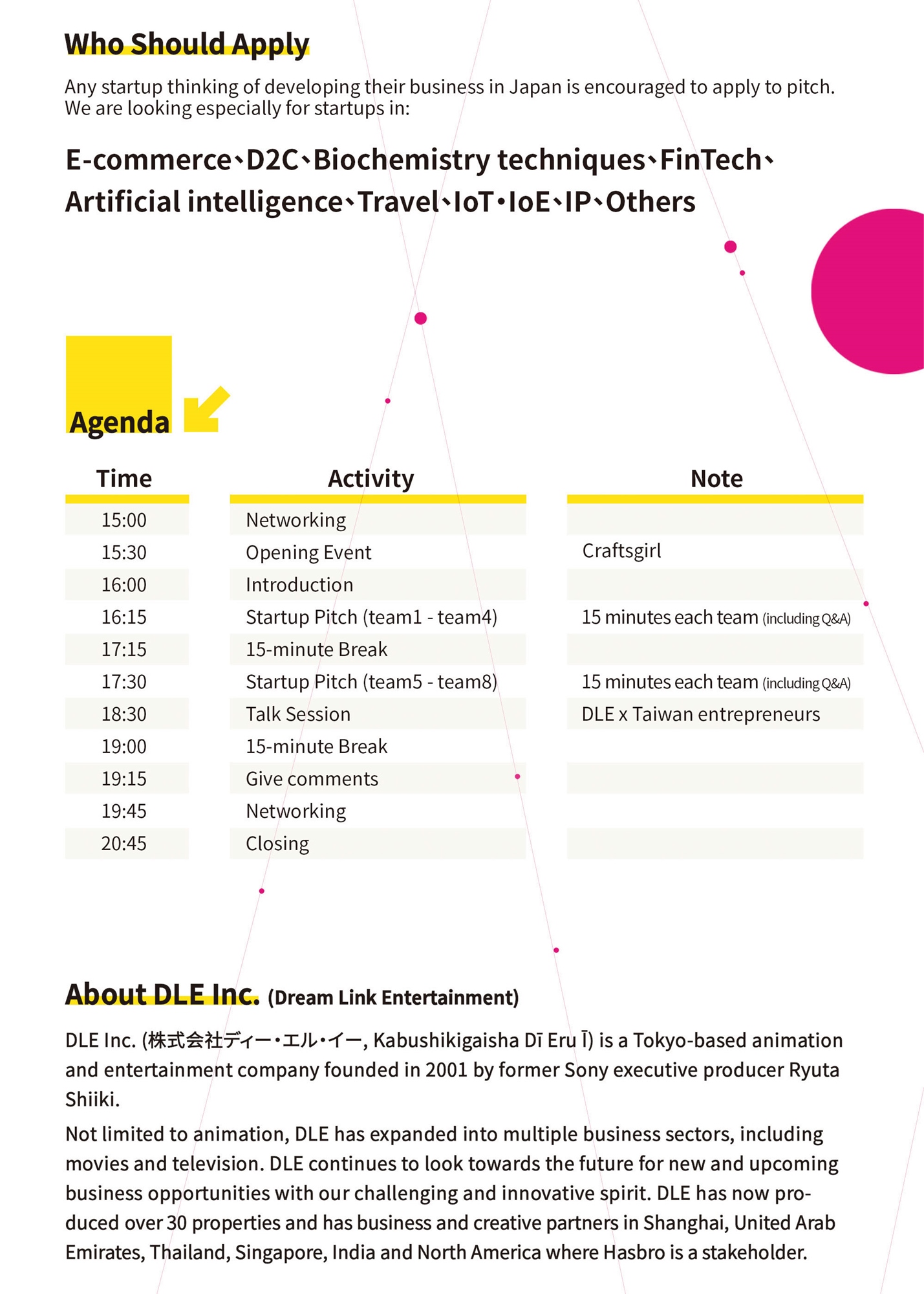 DLE will select the eight most promising teams from applications and invite them to pitch their business. The teams chosen to join the event will get expansion resources. The teams which are chosen to pitch will get the invitation by email on 12/14.