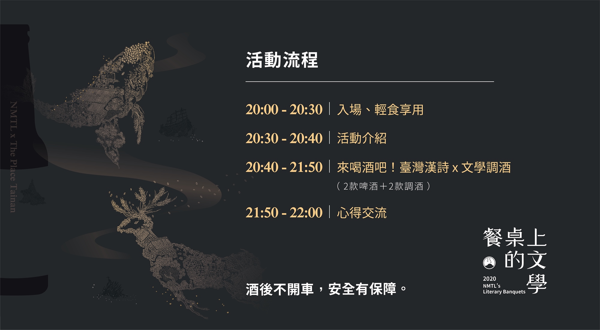 1. 請於20:00-20:30之間至台南老爺行旅5F廿一酒吧完成報到。活動將準時開始,切勿遲到。
