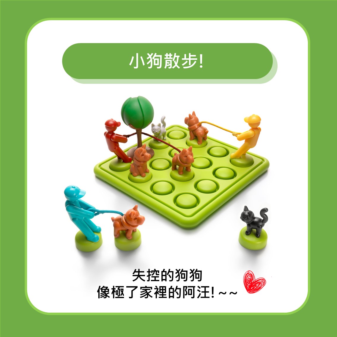 🐶 透過「狗、貓不可相遇」、「繩與繩不能交錯」、「牽繩必須拉直」的情境設定,讓孩子更容易理解遊戲規則。