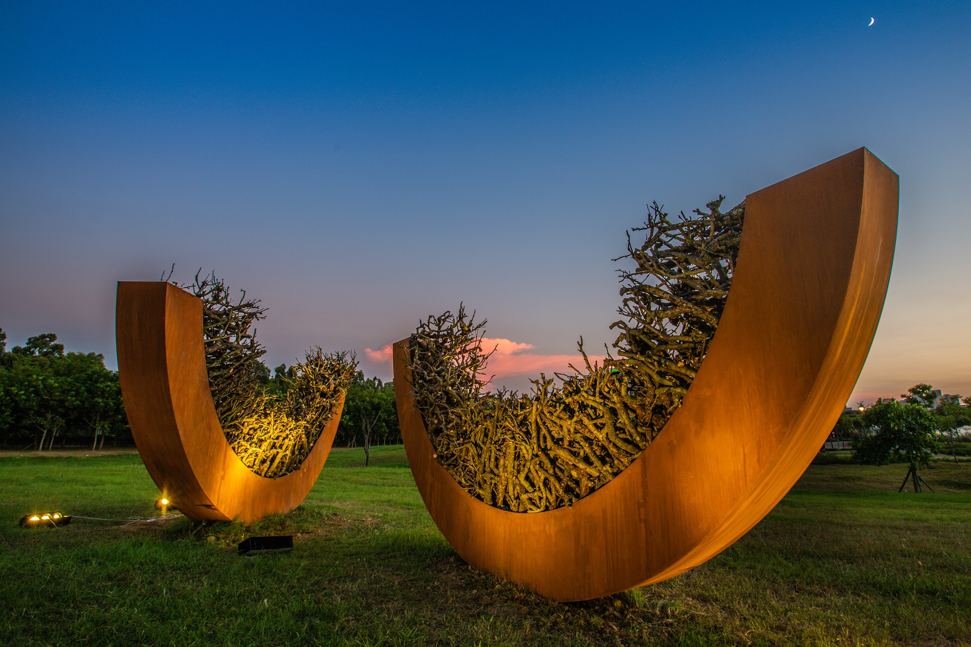 一線微笑、一線舞動,以緣~為出發點打造慢活優雅,植物與鐵的碰撞,隱約襯托出的未知。以植物為創作核心,以南院大地為基底,光與影、亮面與暗面、交織植物成的立體型態。