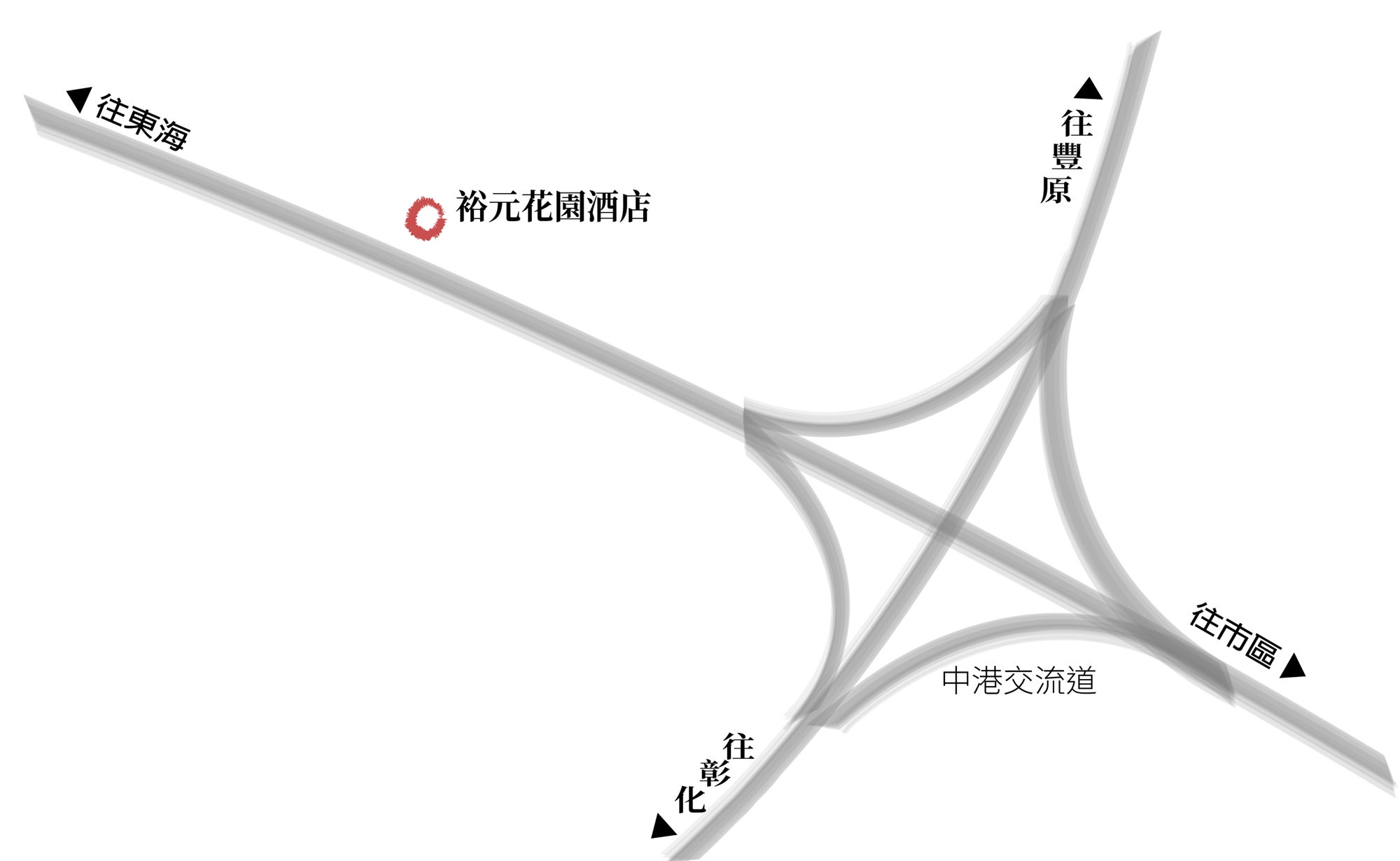 中港交流道1分鐘車程:下中港交流道後,往沙鹿方向,直走約 500 公尺,遇到第一個紅綠右轉進入安和路,左手邊即可看到飯店停車場指示標誌,左轉進入後直行,飯店大門就會在左手邊。