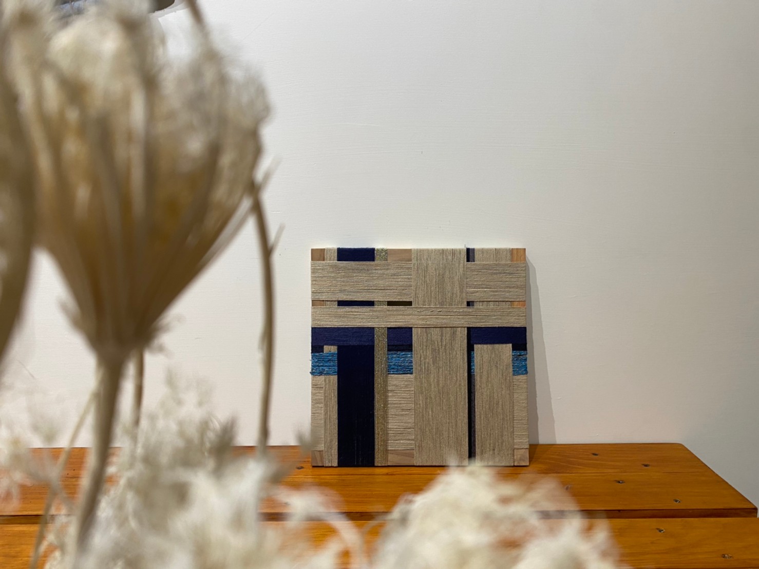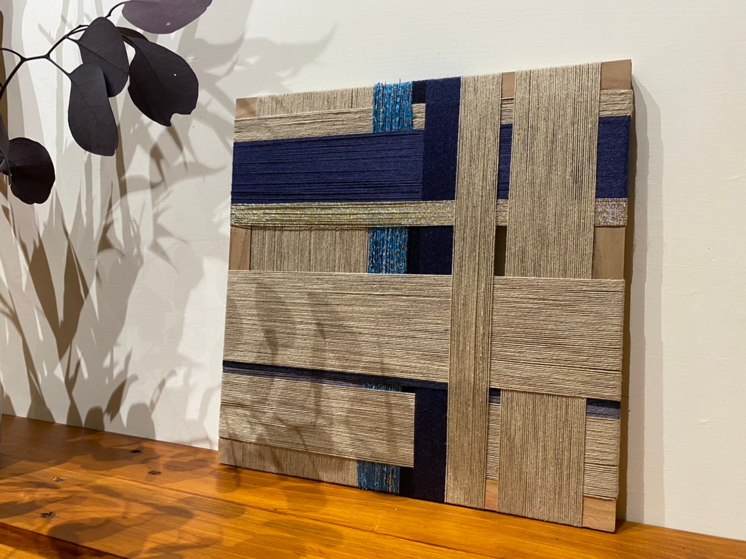 以台灣特有的台灣杉為框,在上頭以棉、麻、花紗編織,完成一副屬於自己的織物畫。