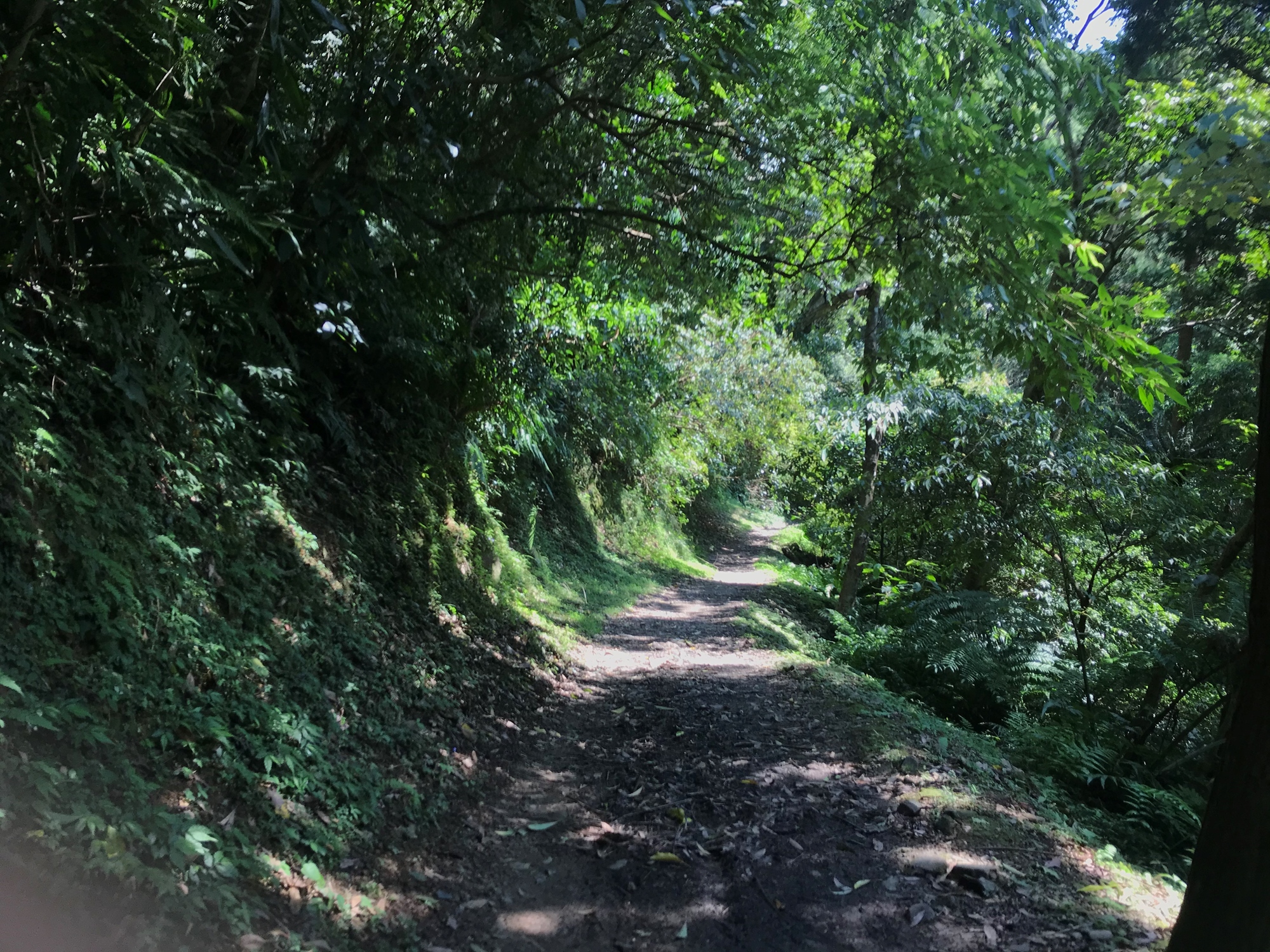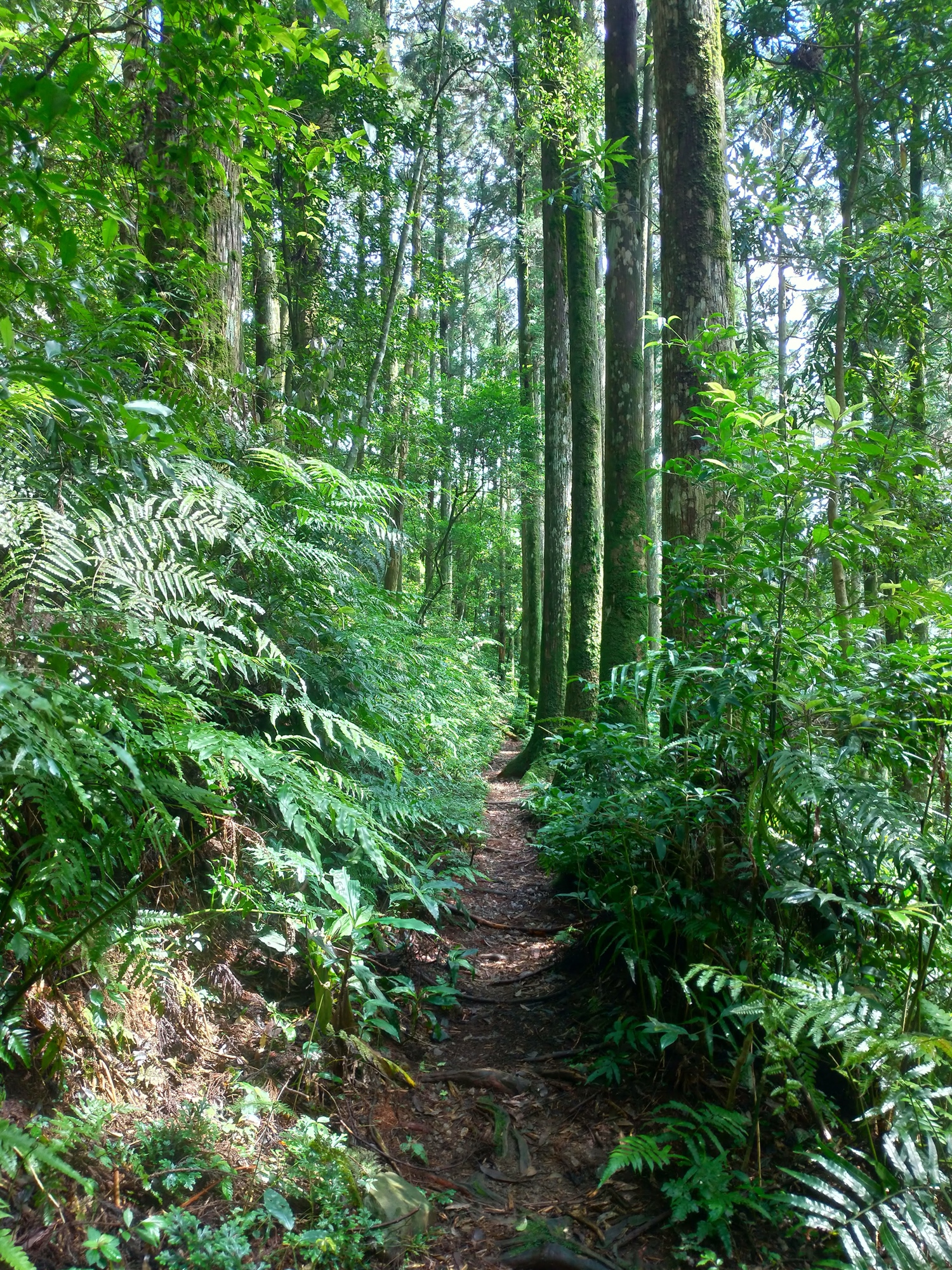 接上東滿步道後,沿步道上升。東滿步道前段多以闊葉林、芒萁、姑婆芋、...等植物為主,中後段景色就轉為柳杉林,道道地地的森林浴步道,非常舒適宜人。
