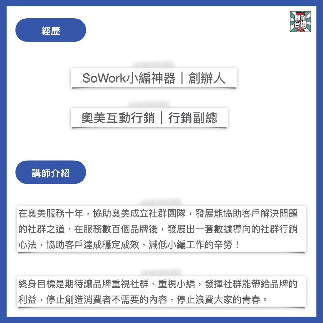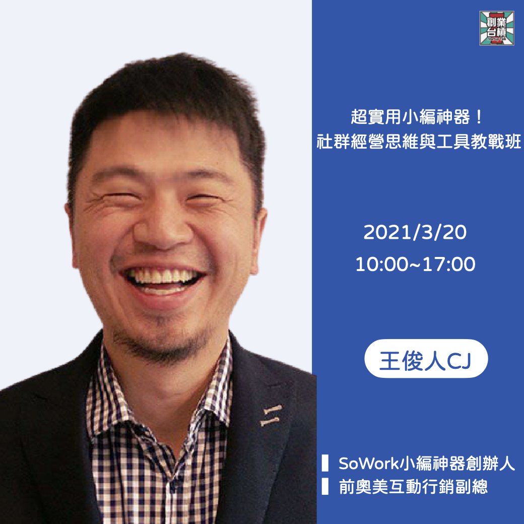 本次課程,邀請到SoWork 小編神器創辦人,前奧美互動行銷副總經理的王俊人老師(CJ Wang),前來分享他投入數百個小時,研究國內外各項社群行銷工具後找到的小編神器系列,不僅能用來分析消費者、研究競爭品牌、找出品牌核心價值,還能快速做圖、做影片、做IG限時動態,讓你從此學會以科技取代人力,不僅效率提升,專業度也會一起飆升!