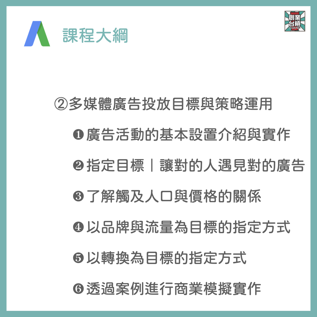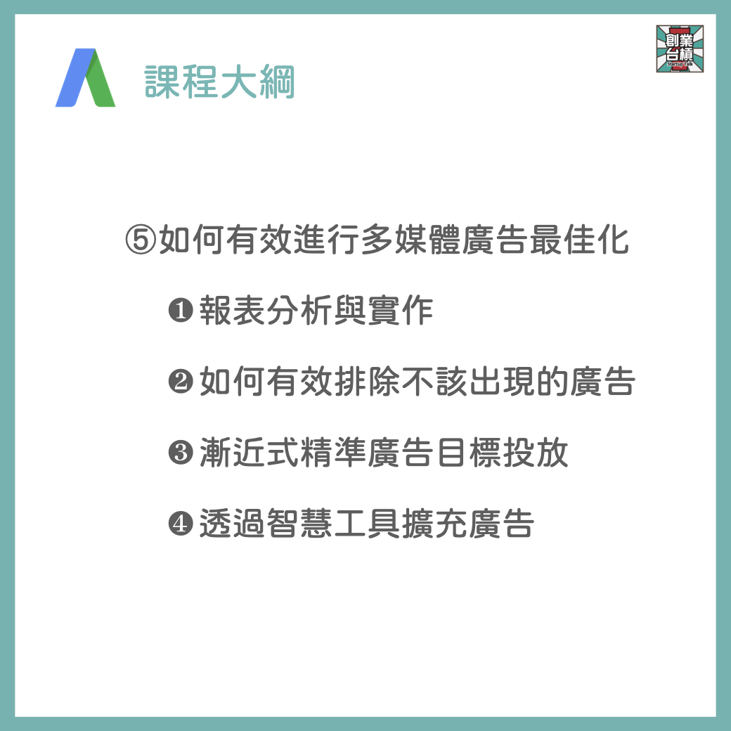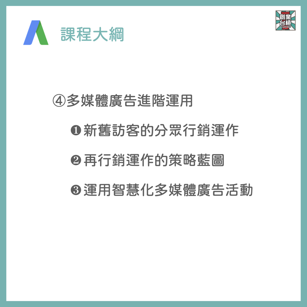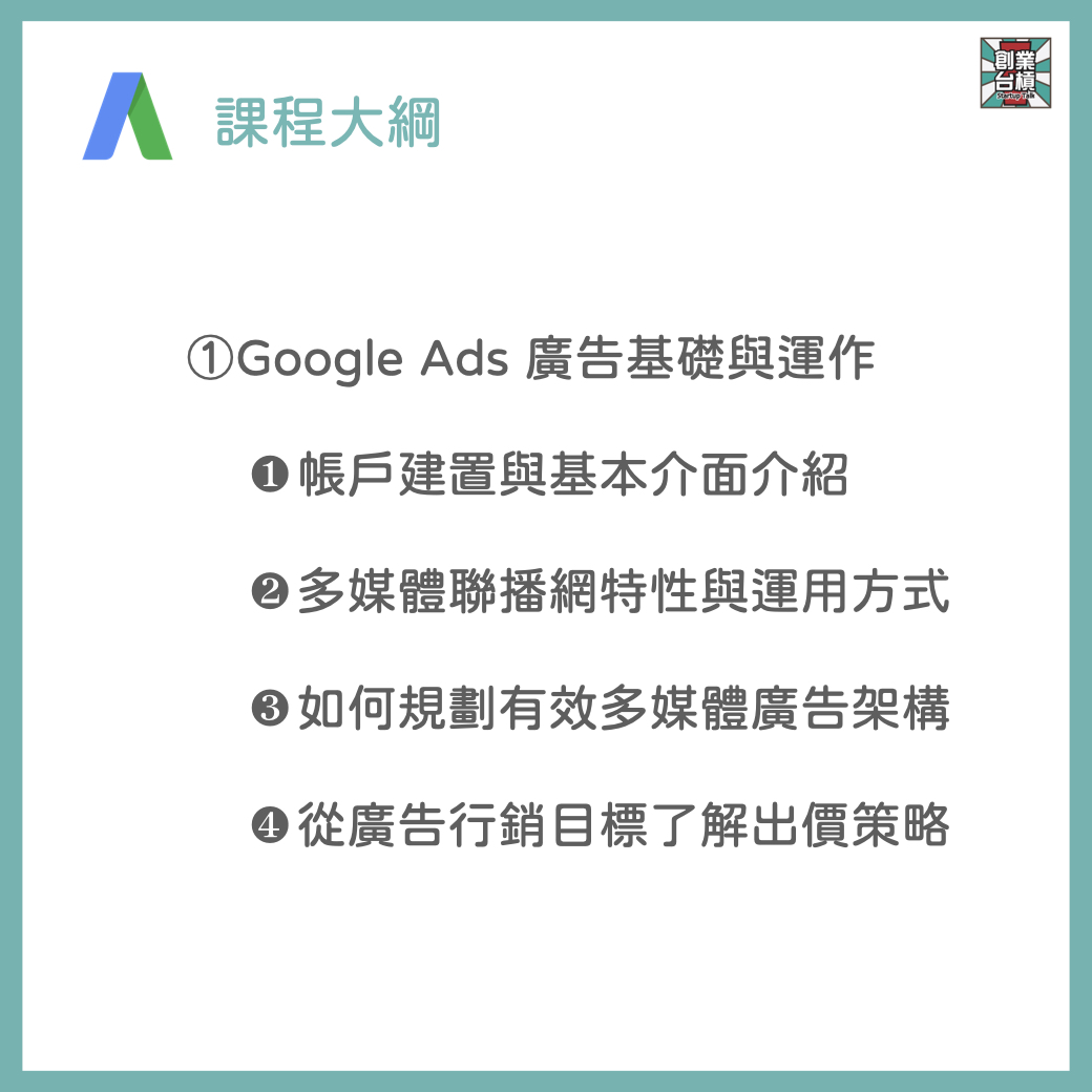 本次課程,邀請到Google Ads 全球官方認證講師蘇穎泰,從 Google Ads基礎開始教學,再進入到多媒體廣告的領域,並以不同的行銷目標劃分維度,介紹各種形式的行銷方式。由淺入深的行銷教學,能讓學員更能掌握及了解多媒體聯播網廣告。