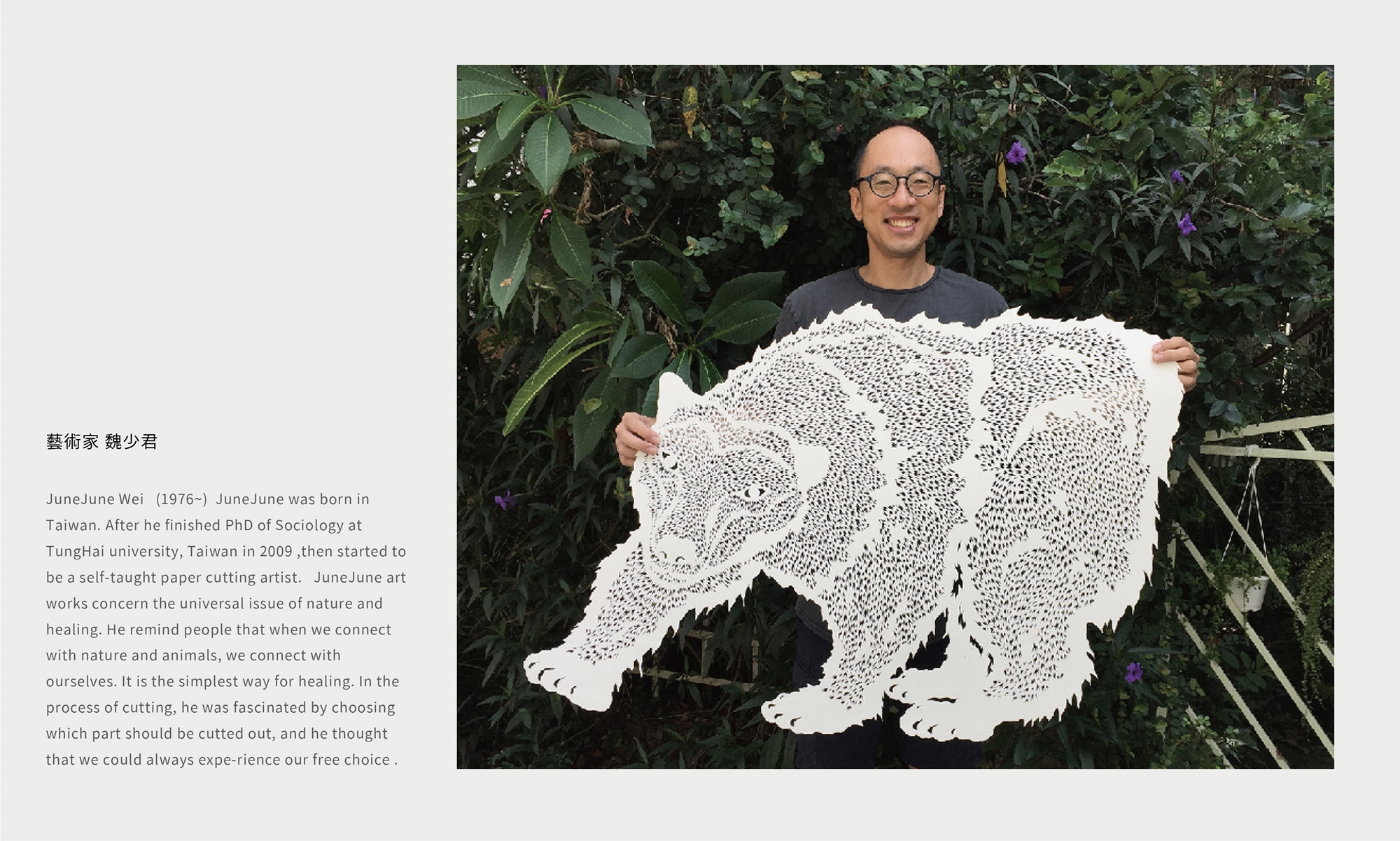 1976年,出生於台灣。于東海大學社會學系取得博士學位之後,跨領域投入藝術創作,選材紙刻,展現其直觀、柔弱與開放的創作特質。主題環繞「自然」與「療癒」兩大核心,喜愛動物的心是其發展創作的一大動力。刻紙的時候,選擇什麼部分要放下,什麼部分要保留,是最有趣的過程。認為自由創作,是透過每一次的創造,完整體驗自己的選擇。