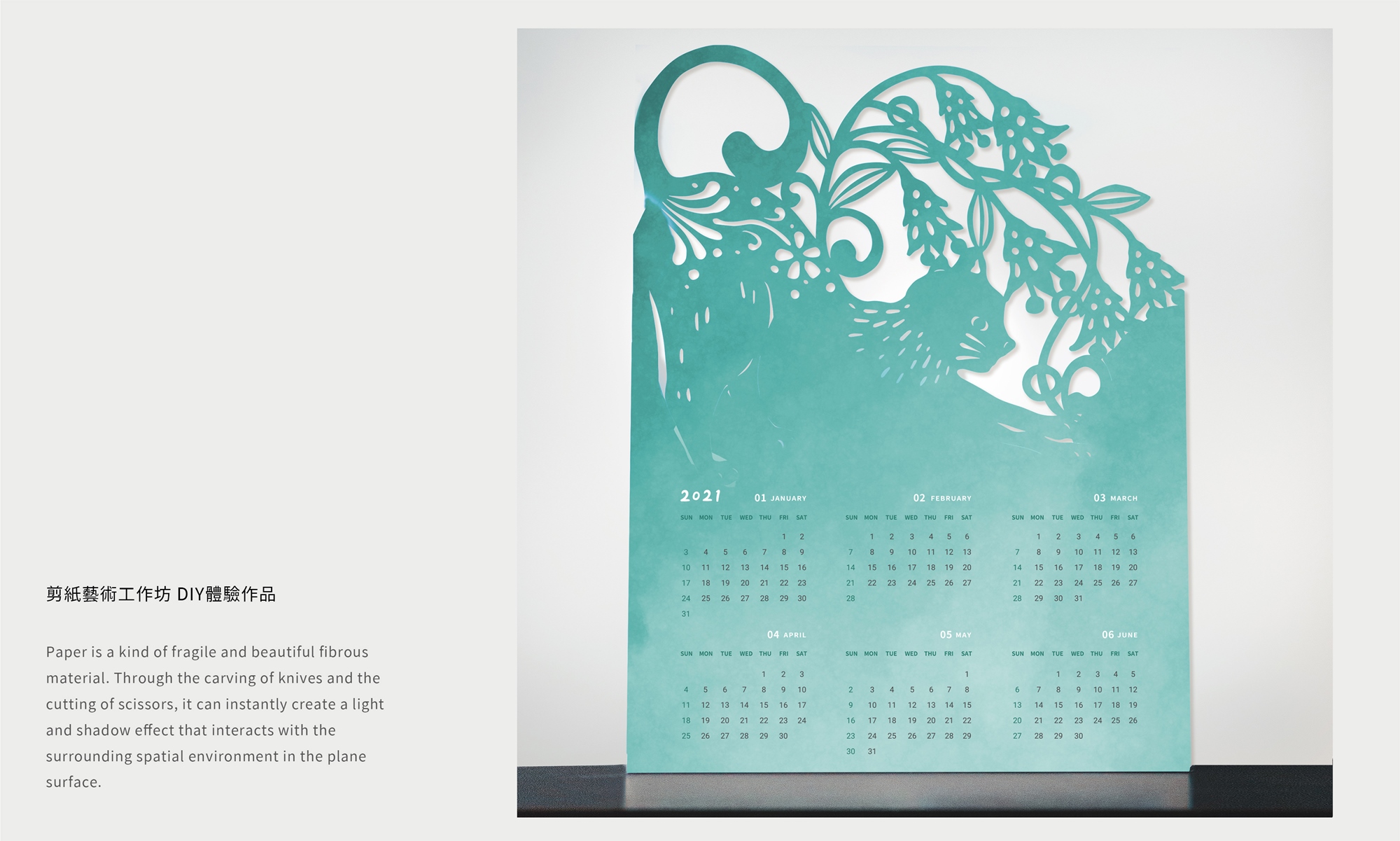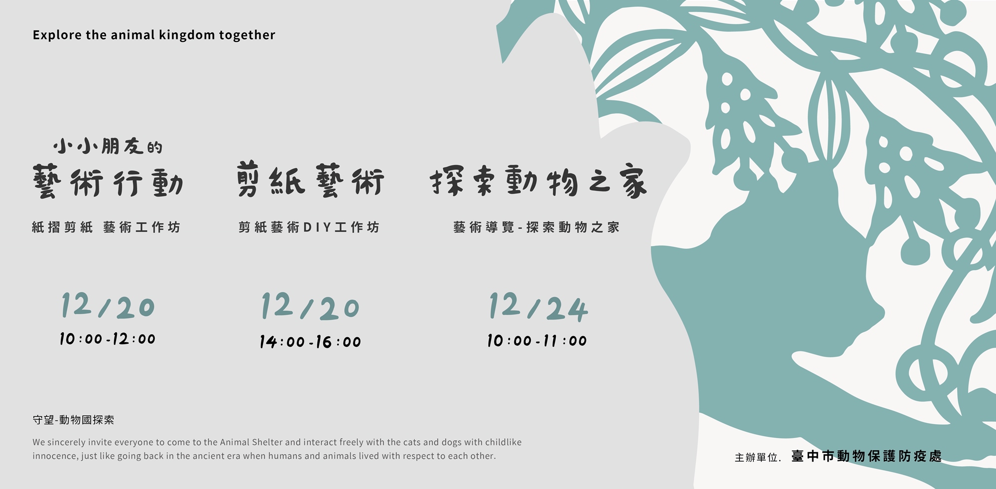 剪紙藝術體驗工作坊,帶領民眾認識、體驗剪紙工藝。以動物之家的貓狗為主題,製作屬於自己的剪紙作品。以動物為題,將剪紙藝術應用到日常生活用品。在剪紙藝術家的帶領下,創作獨一無二的動物剪紙年曆。