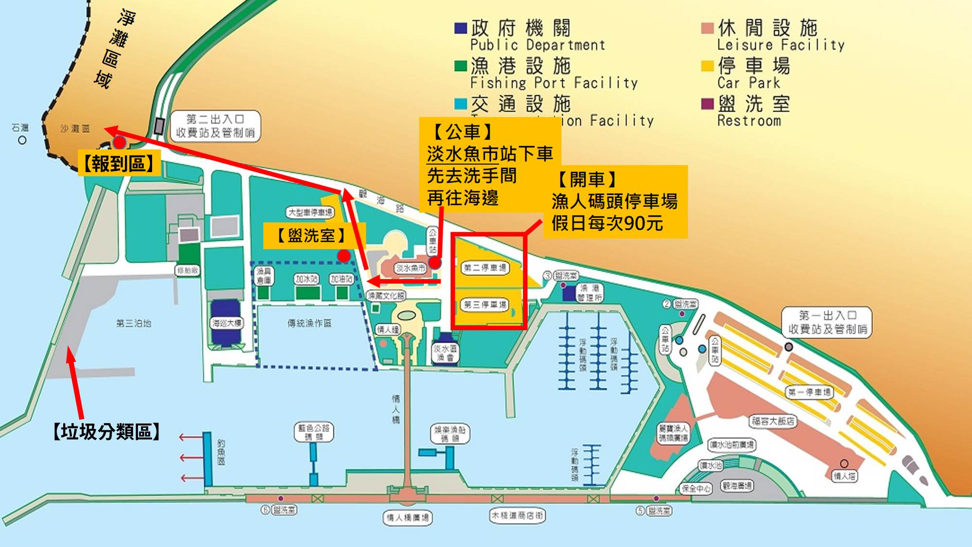 1.自行開車:開車至漁人碼頭停車場(新北市淡水區觀海路199號),走到【淡水漁市】公車站牌,依引導走到報到地點(詳如下方地圖)。