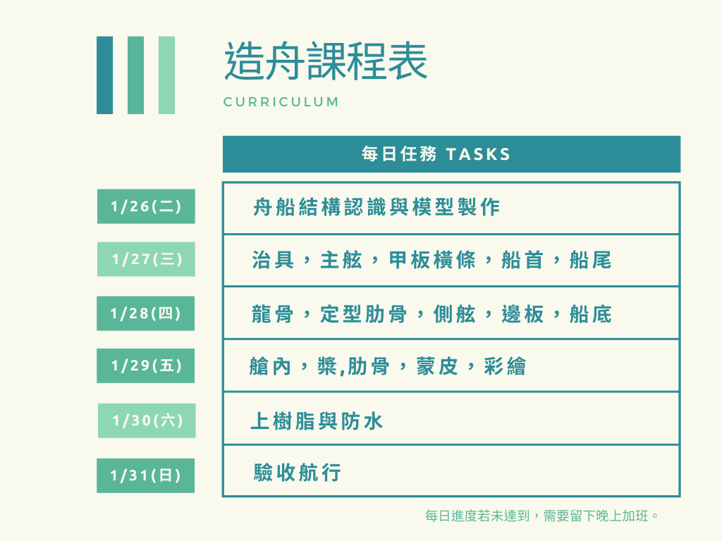 團隊合作:從DIY獨立製作舢舨舟模型,到DIT(Do it Together)團隊造舟,學員們將學習互相包容與共同克服困難的團隊精神。