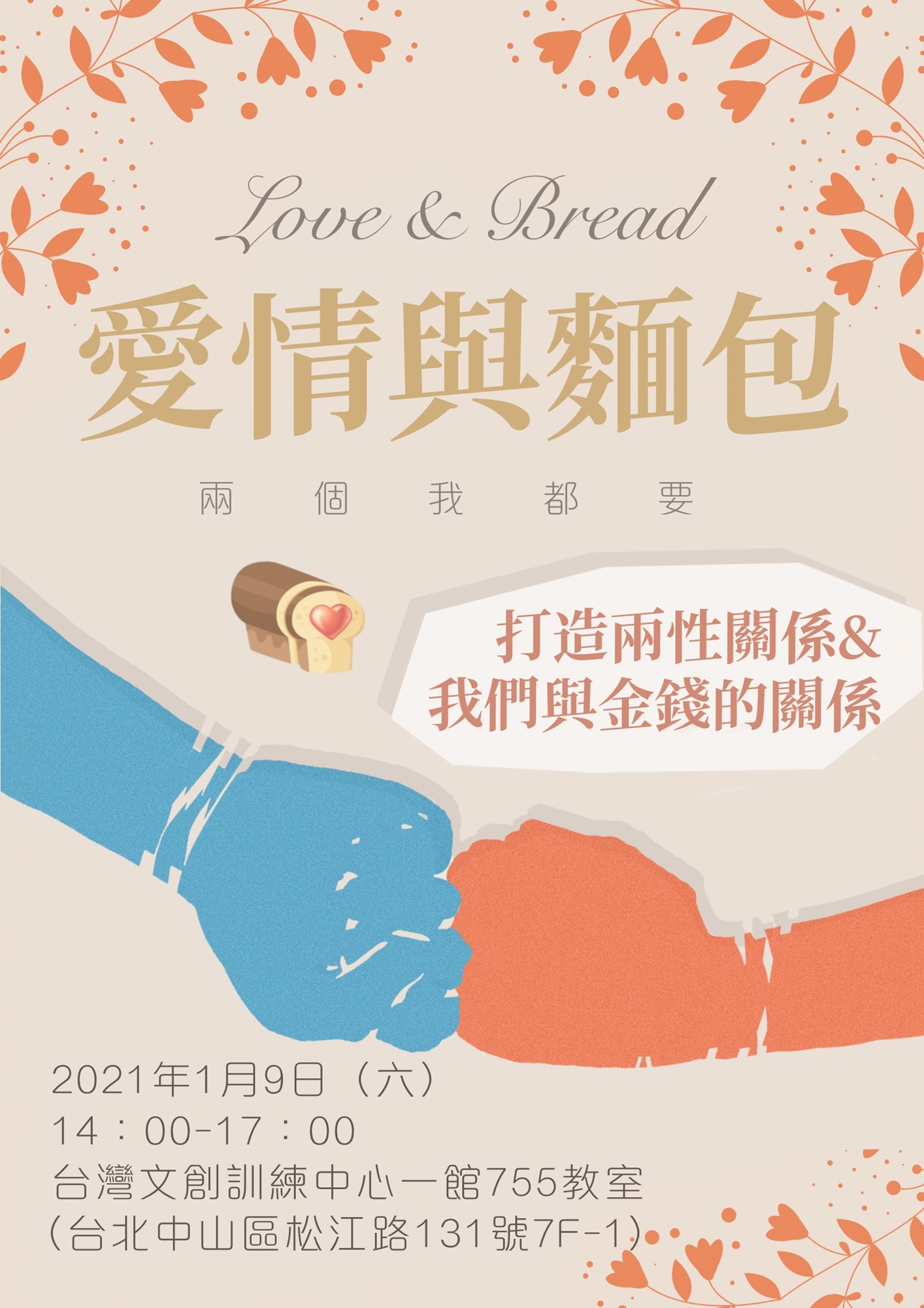 活動時間:2021/01/09(六)14:00-17:00(台北場) 愛情與麵包兩個我都要講座