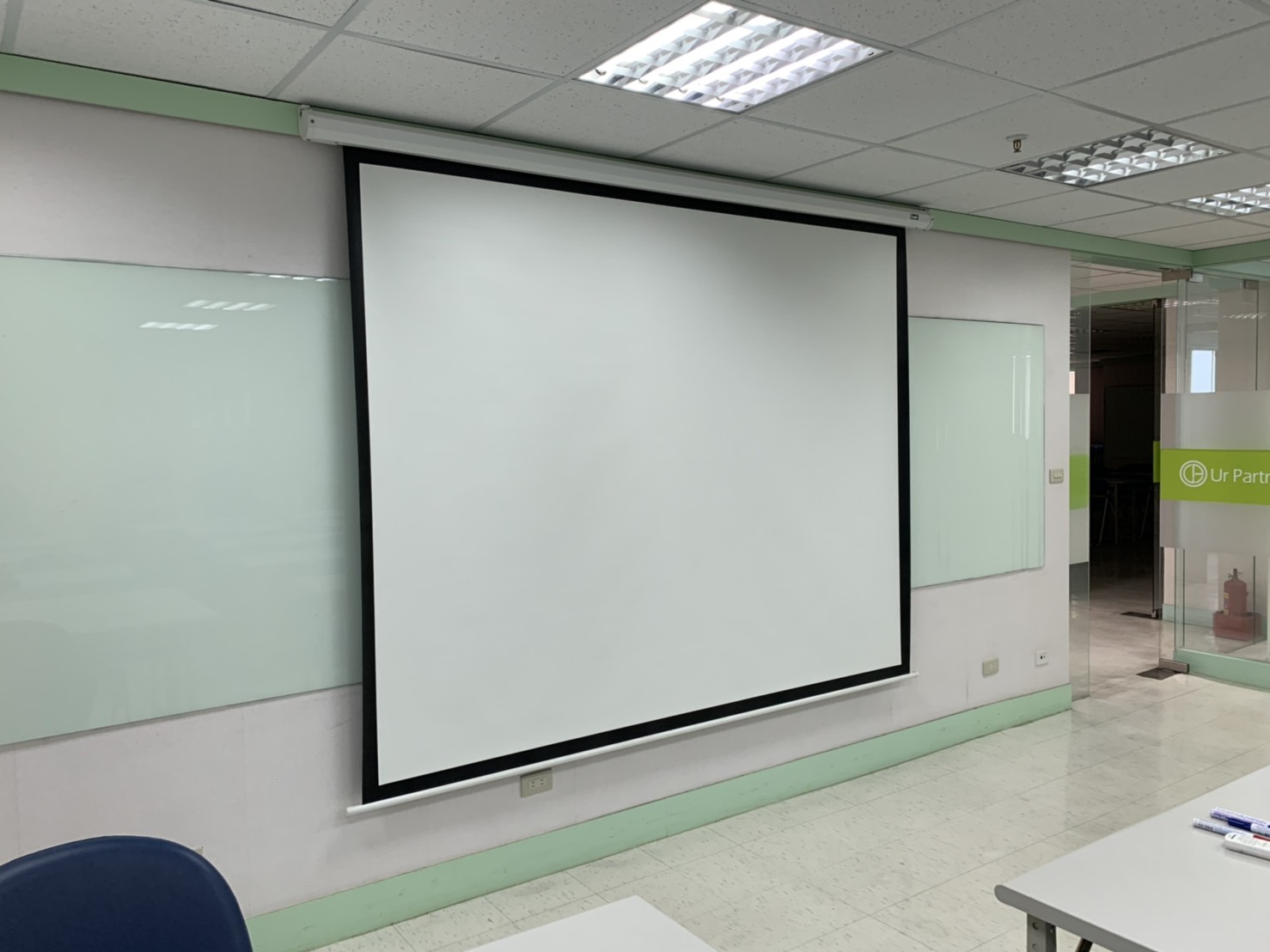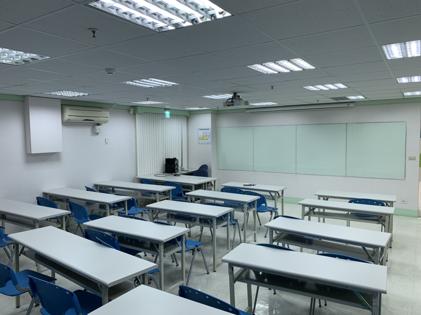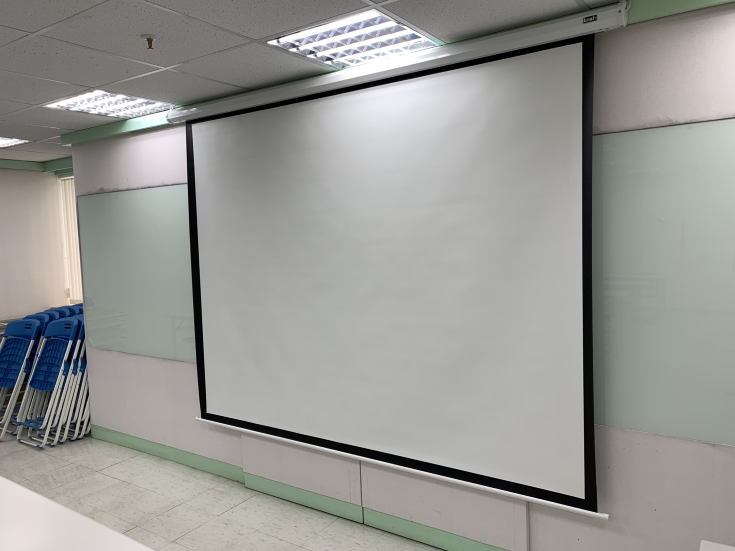 玻璃白板、麥克風、投影機、布幕、音響設備、冷氣、飲水機