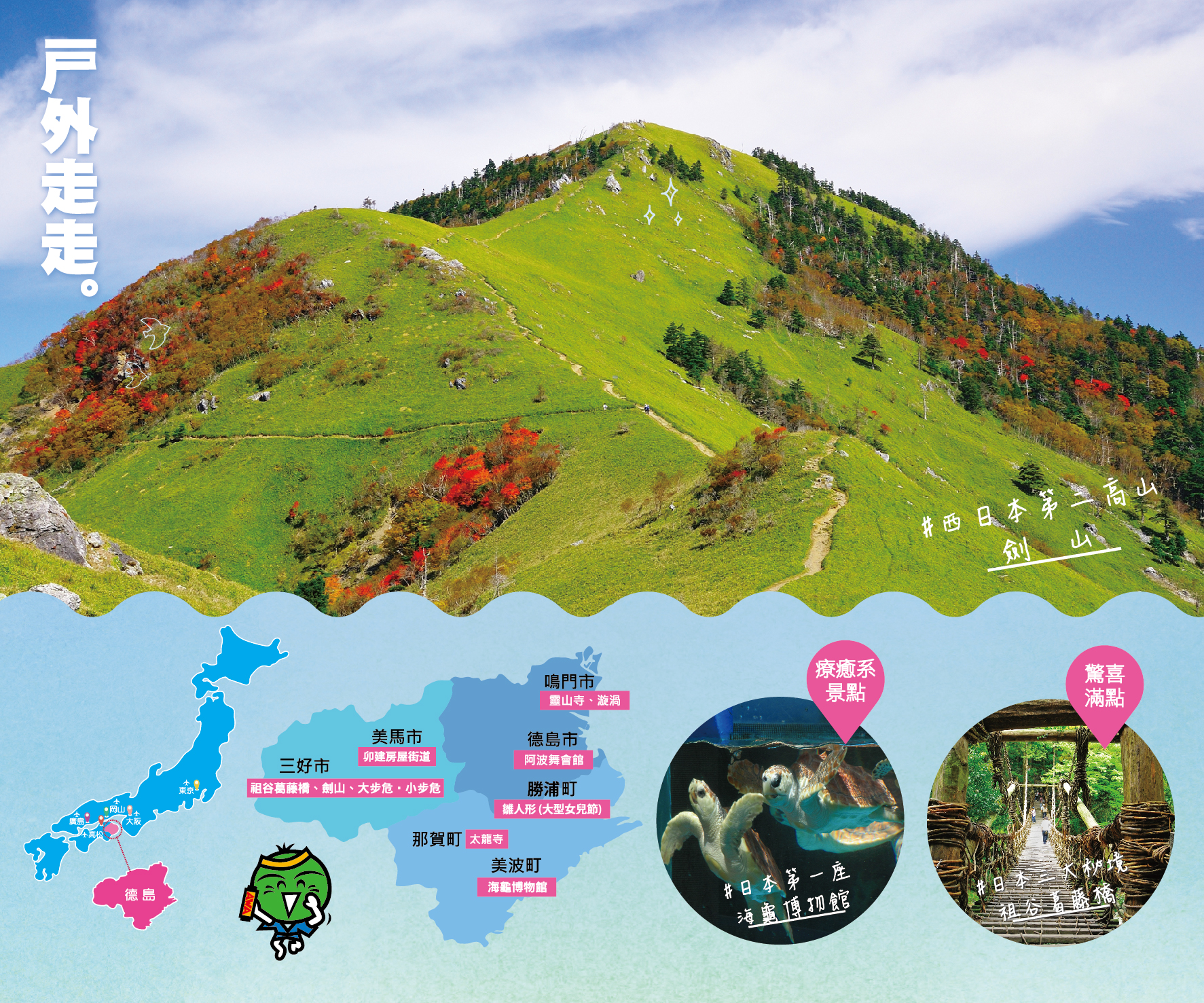 擁有400年歷史的「阿波舞文化」,以及知名JAPAN BLUE藍染製品、大谷燒、竹人形等多種傳統工藝,更有得天獨厚的自然美景─「鳴門漩渦」、「大步危溪谷」等必訪景點,以及療癒系景點「海龜博物館」,除了景點外,德島美食也相當豐富,從祖谷鄉土料理、溫泉旅館的宴席料理、阿波尾雞到南部海鮮,美食一應俱全。