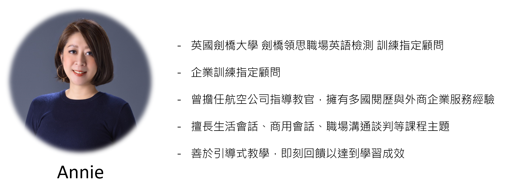 Yahoo 指定英文顧問 Annie老師將用最真實的情境演練,立即給予個人回饋與指導,找出最適合自己的聊天策略與個人口說魅力,讓你在嚴肅的工作場合中也能輕鬆聊出好印象。