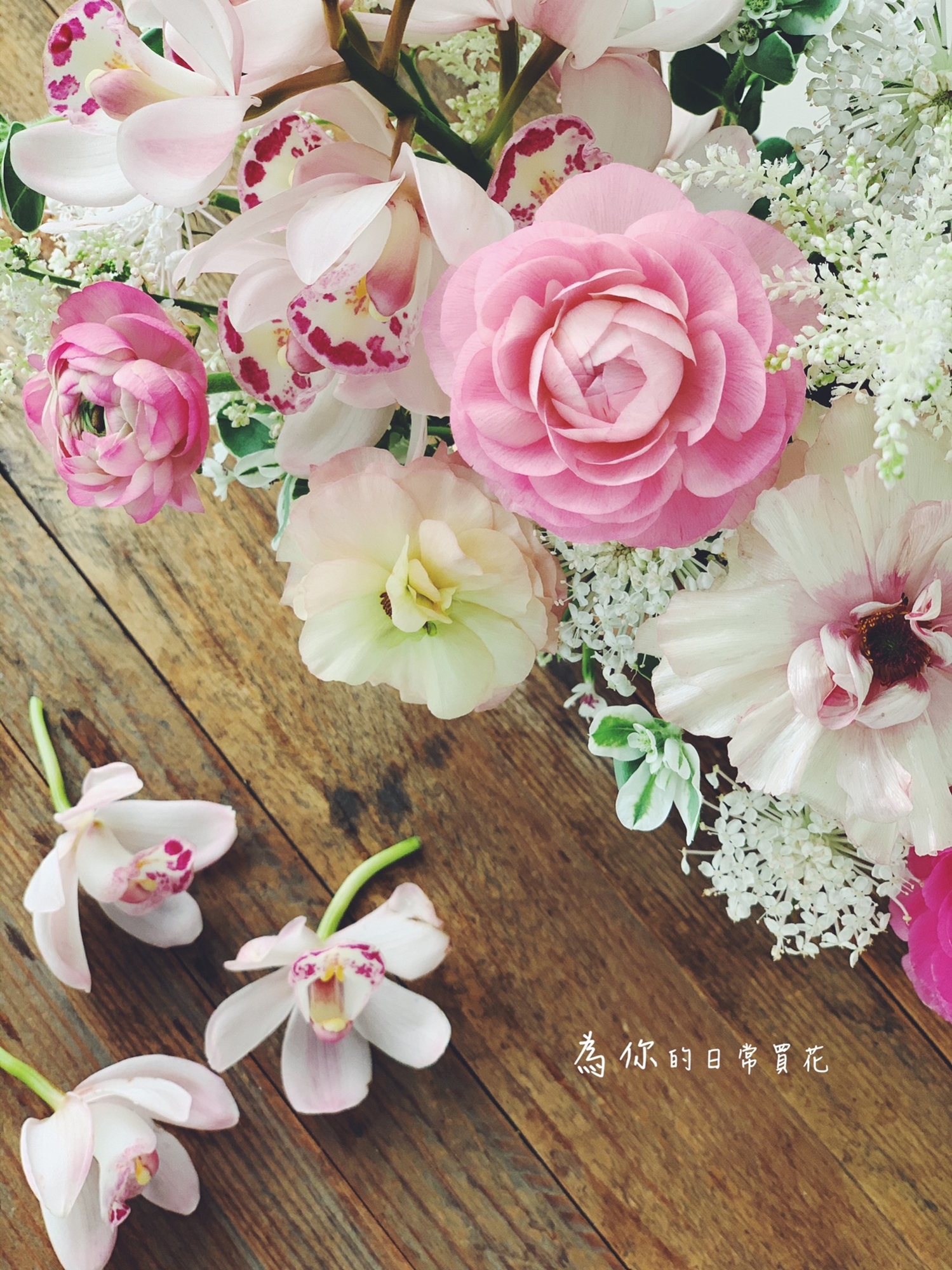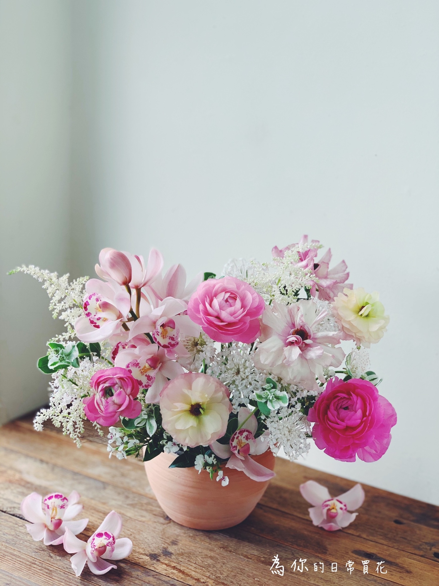 *實際將以當週花市的花材進行搭配、設計,如果遇到缺貨將以同等級以上的進口玫瑰花代替。