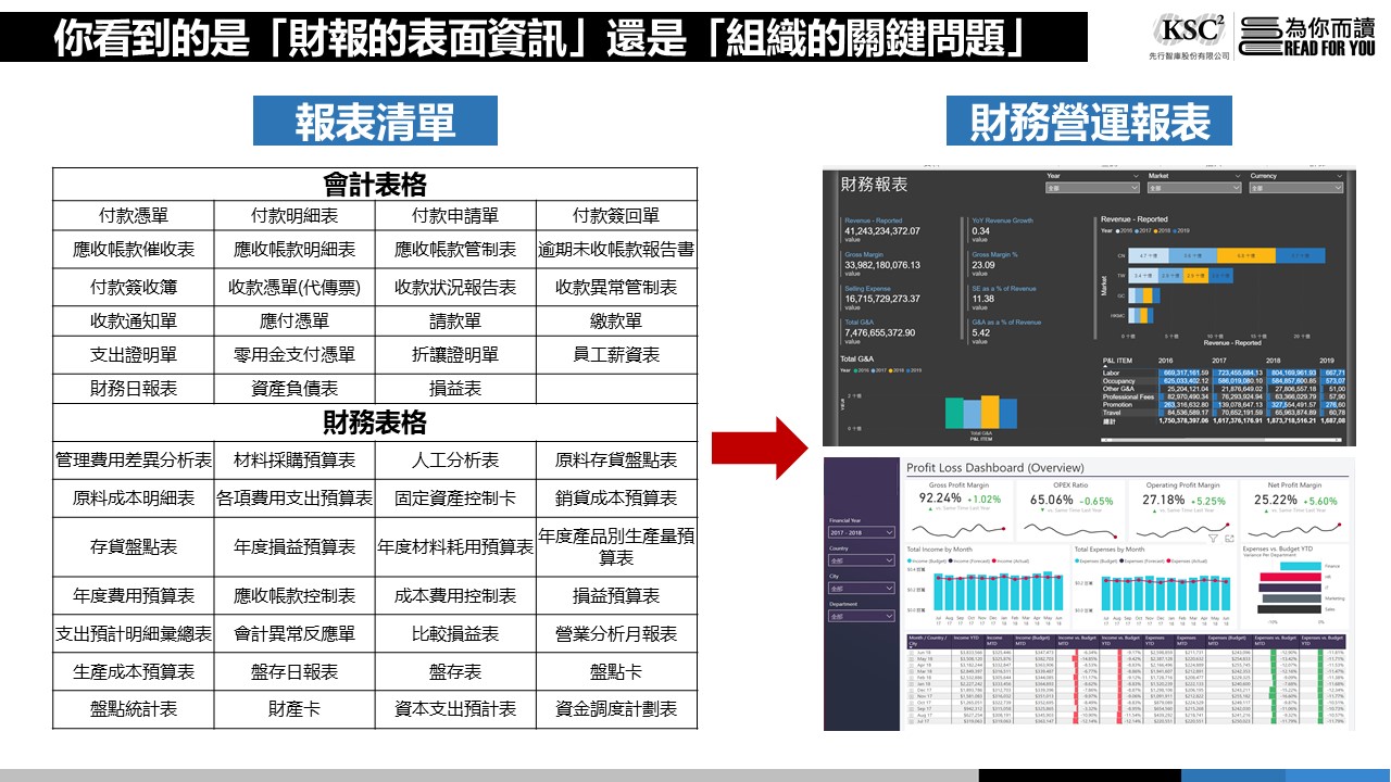▍你在做財務分析時,是否曾面臨過以下難題? 1. 分析不到位,淪為做表格工具 一大堆單純輸入資料的報表常被客戶或主管退件重做。或者需要透過複雜的Excel公式才能把報表整理出來。甚至因為不同單位需要不同報表,花很多時間製作重複的報表。 2. 報表製作費時,耗費許多時間 公司的報表不符合工作需求,資料規格不統一,只能自己花時間整理與合併不同資料來源,有時候還會遇到資料太多電腦卻跑不動。 3. 抓不到重點,問題分析不到位 不知如何透過財務數據找出企業的關鍵管理問題,而不是只做表面的分析報告。不知道如何把不同部門的資料做彙整,找出數據之間的關聯性。 4. 數字論數字,沒挖掘業務層面 羅列數字不代表分析,挖掘數據背後的故事,如營收或業績下滑的原因,才是主管真正想要知道的答案。 5. 財報呈現不直覺美觀,看不懂 想要整合大量複雜的資料,呈現出能讓老闆或客戶一看就懂的管理報表。 |
