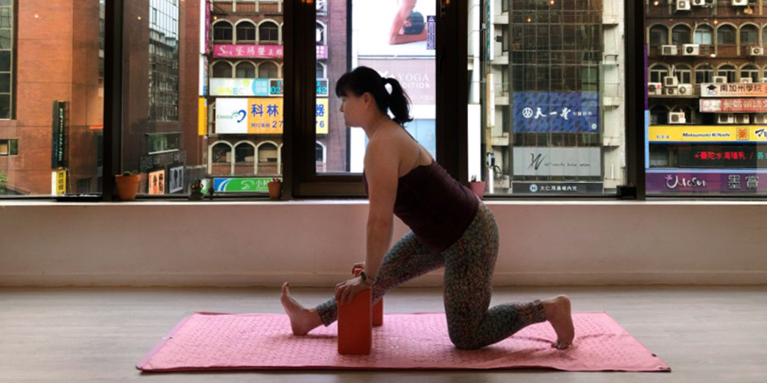 1. 高跪姿,右腳往前伸直腳板勾,保持左臀在左膝上方,右臀微微向後拉,骨盆正,雙手扶磚,吸氣胸口向前延伸,側腰拉長,吐氣感覺大腿後側到下背延展。